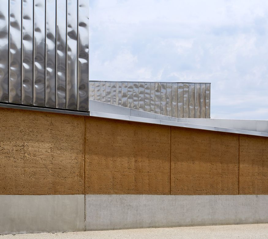 « En associant terre crue et inox, la matérialité de l’édifice relie modernité et tradition en réponse aux enjeux écologique contemporains », expliquent les architectes. Quant au béton, outre son rôle d'assurer la stabilité du bâtiment, il l'isole également des infiltrations d'eau venant tant du haut (pluies) que du bas (humidité ascensionnelle à travers les murs en pisé). Les architectes ont également voulu, en choisissant le béton et l'inox, jouer sur le contraste entre la rugosité du premier et l'aspect lisse et réfléchissant du second. Le rendu est surprenant, sur ce bâtiment d'un peu plus de 4 000 m2 en pleine zone urbaine.
