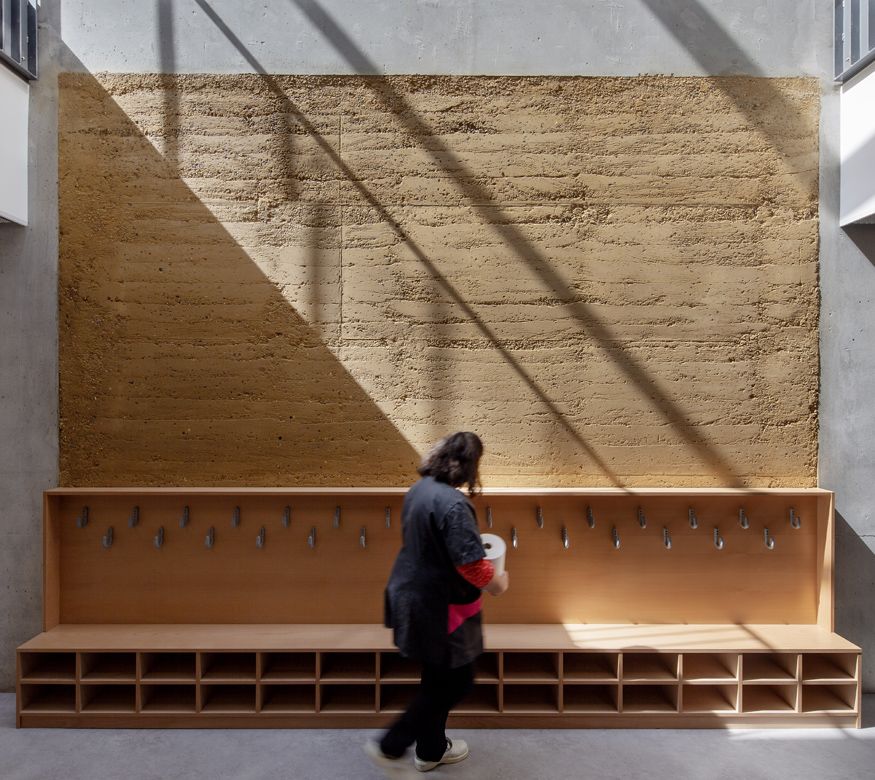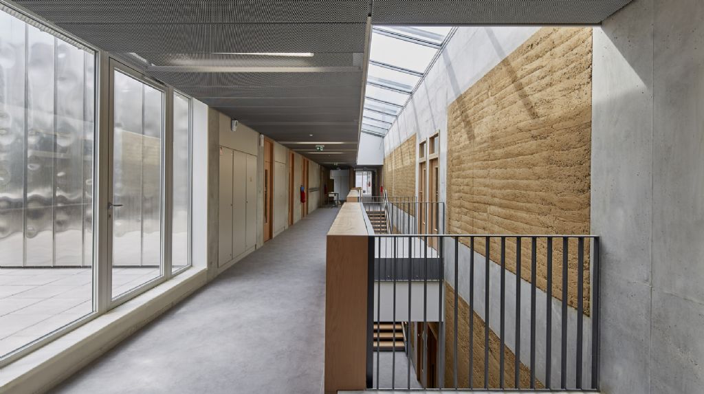 Pour cette conception particulière, TOA s'est associé à CRAterre, le Centre international de la construction en terre, et a choisi la technique du pisé. Les murs du bâtiment, d'une épaisseur de 30 à 40 cm, sont donc constitués de terre crue locale (produite à moins de 100 km du chantier), tassée par strates entre deux planches. Cette terre crue a de nombreux avantages. Le premier est de ne pas consommer d'énergie pour une quelconque transformation ou cuission. Le second est de réguler parfaitement l'hygrométrie dans les espaces intérieurs. Sa porisité lui permet également d'être un excellent isolant acoustique, ce qui n'est pas négligeable dans un bâtiment scolaire. Enfin, l'inertie de la terre crue garantit fraîcheur en été et chaleur en hiver.