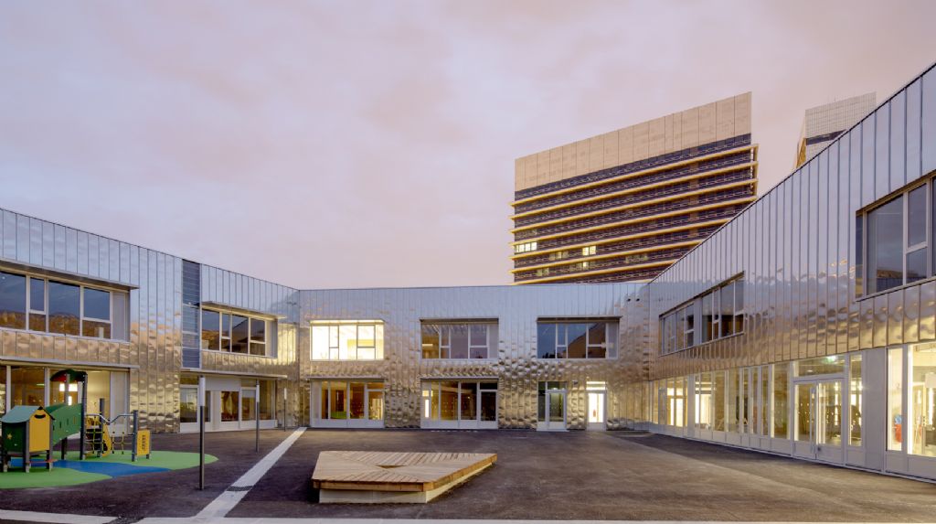 Livré en août dernier, ce bâtiment comportant 15 classes maternelles et élémentaires se situe au cœur d’un environnement bâti dense et vertical, entre le mont Valérien et la Seine. Le bureau TOA a donc décidé de faire preuve d'originalité pour séduire la Ville de Nanterre, maître d'ouvrage du projet. Comme le résument les architectes : « Ancré au sol par son fondement en terre crue, suspendu au ciel par l’immatérialité de sa vêture inox, le groupe scolaire Miriam Makeba se fond dans l’horizontalité du paysage. »