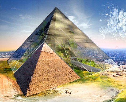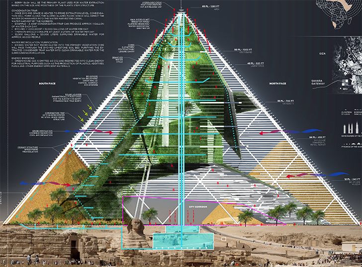 Dans la foulée de la COP21 qui s'est achevée par un succès (à confirmer dans les faits), nous vous proposons un projet original qui a pour but de lutter contre la désertification. Ce projet de gratte-ciel géométrique et écologique s'appuyant sur les pyramides égyptiennes de Gizeh a reçu une mention lors de l'édition 2015 de la eVolo Skyscraper competition.