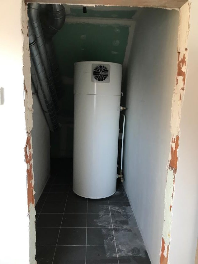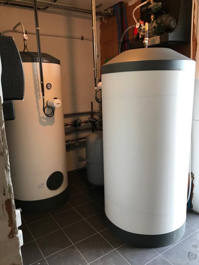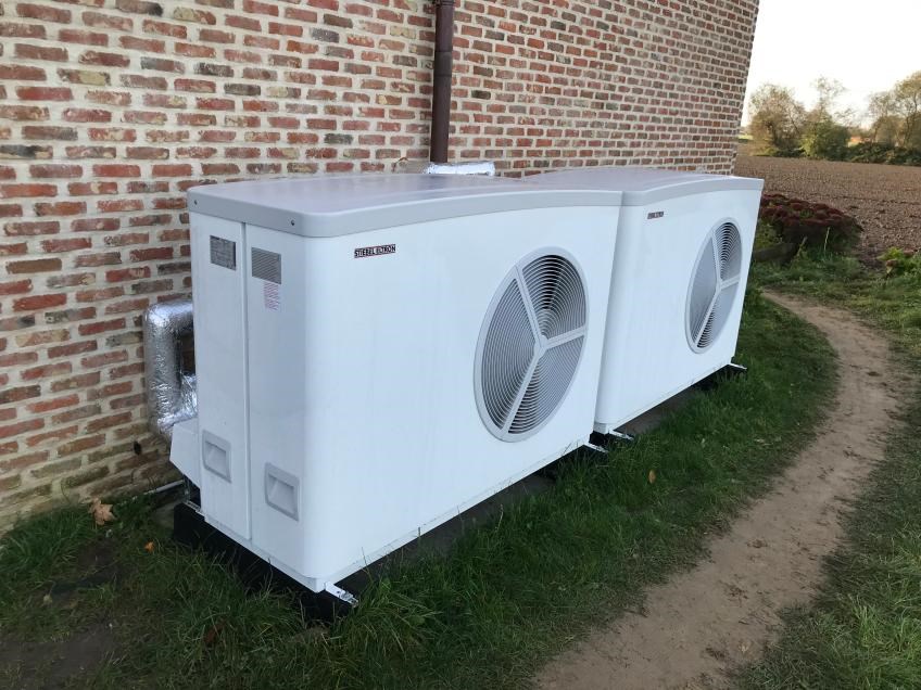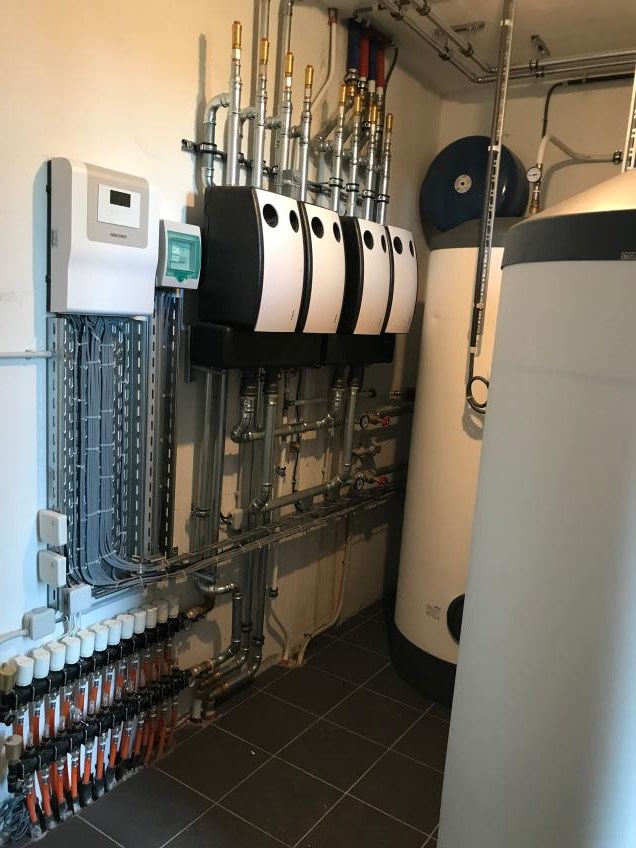 L’installateur ONISA Sprl y a installé 2 pompes à chaleurs air-eau STIEBEL ELTRON en cascade liées à un ballon d’eau chaude sanitaire de 700L et à un ballon tampon servant pour le chauffage de tout le bâtiment, l’installation est divisée en 3 groupes de chaleur et la chaleur est diffusée au rez-de-chaussée et à l’étage par un chauffage au sol. Un chauffe-eau thermodynamique a été installé à l’étage pour garantir, en cas de capacité complète, la continuité en eau chaude sanitaire.