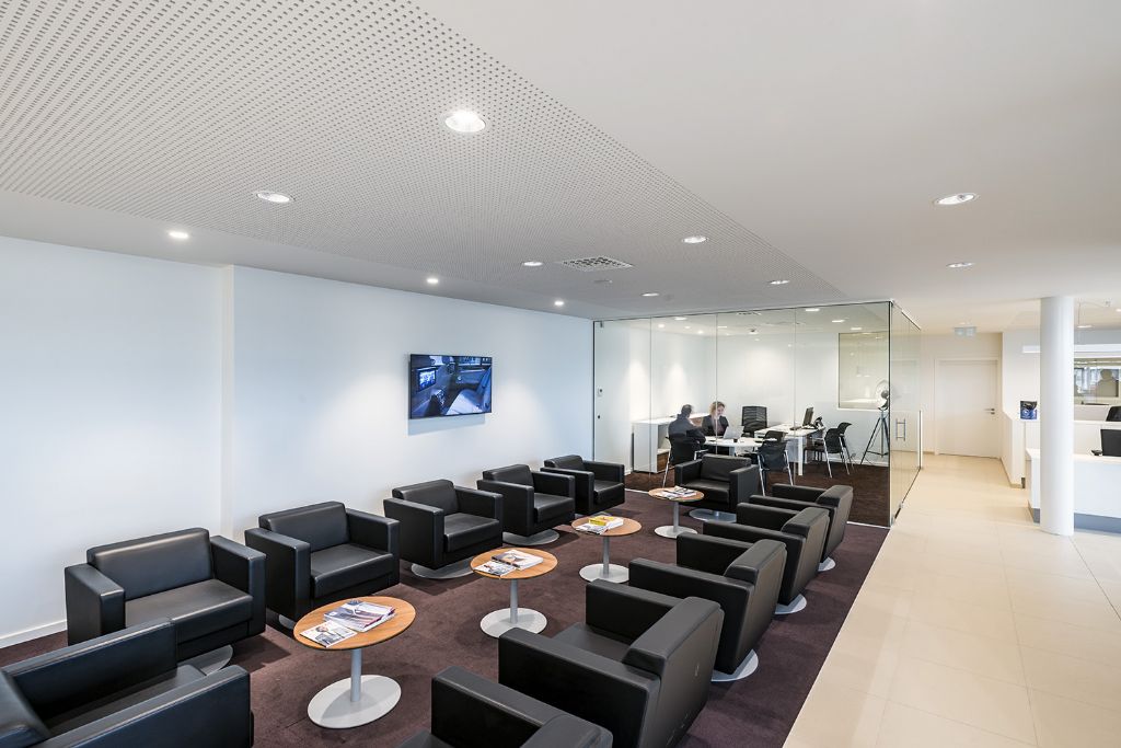 Bien entendu, les produits utilisés n'offrent pas seulement des avantages pour le parachèvement à sec. Les plaques SoundDesign Cleaneo, comme leur nom l'indique, satisfont à toutes les exigences en matière d'acoustique. Leur absorption acoustique et la régularisation de la réverbération font du nouveau showroom un lieu de travail et de réception très accueillant. Les plaques contribuent en outre à un meilleur climat intérieur et à un air plus sain et elles ne rétrécissent ou ne gonflent que peu ou pas lors d'un changement de conditions climatiques. Avec une stabilité au feu de 30 minutes, les plaques SoundDesign Cleaneo tirent également leur épingle du jeu sur le plan de la sécurité incendie. Ce laps de temps est aussi garanti en présence de perforations, de caissons lumineux, de trappes de visite ou de gaines de ventilation.