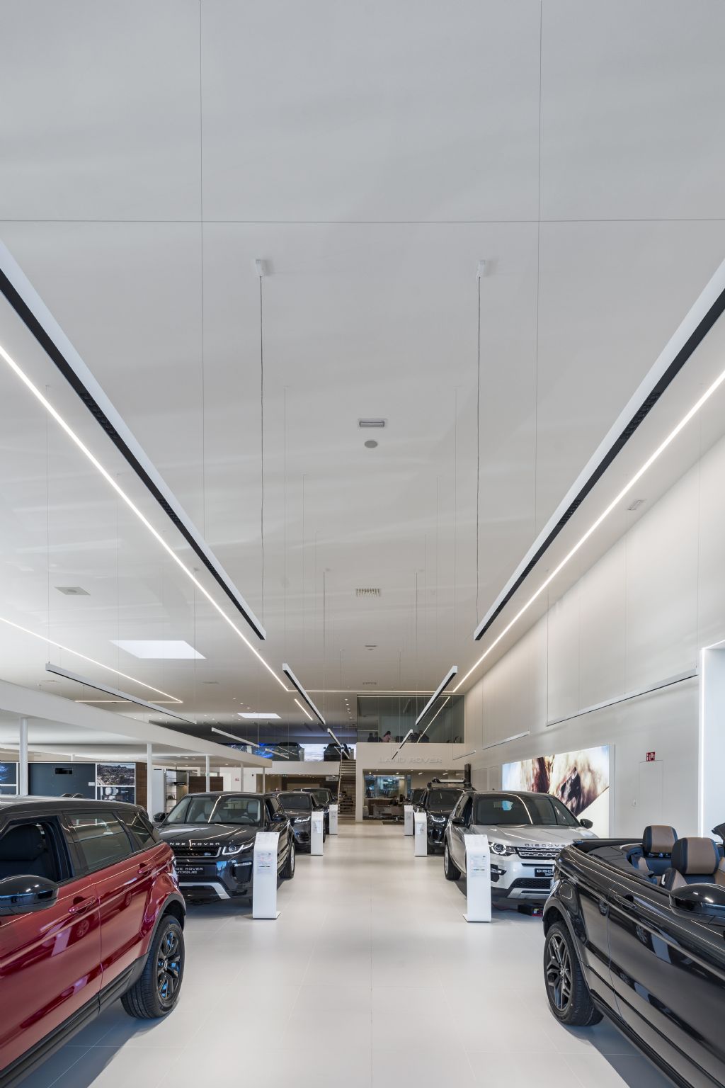 Dans un showroom, il va de soi que l'attention ne doit pas se porter sur la pièce elle-même, mais bien sur les produits qui y sont exposés. Plus la finition de la salle est simple et épurée, mieux les produits sont mis en valeur. C'est le cas dans le nouveau showroom de Jaguar, Land Rover et BMW à Drogenbos, il convient donc pour une fois de mettre le showroom sous les projecteurs. « Les systèmes Knauf pour murs et plafonds sont non seulement très performants en matière d'esthétique et d'acoustique, mais ils nous offrent aussi quelques avantages considérables », explique-t-on du côté de l'entreprise de construction Coenen.