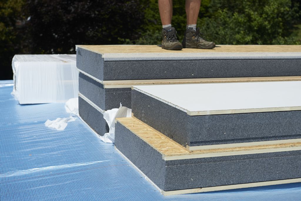 Ces éléments de toiture conviennent pour des toitures plates à légèrement pentues et sont constitués d’un noyau en EPS Platinum modifié ignifugé. La face extérieure est pourvue d’un panneau OSB III de 12 mm. La finition de la face intérieure qui est doublée d'une plaque de carton plâtre de 12 mm posée entre 2 raidisseurs, est réalisée au moyen d’un panneau d'aggloméré de 3 mm avec pare-vapeur intégré.