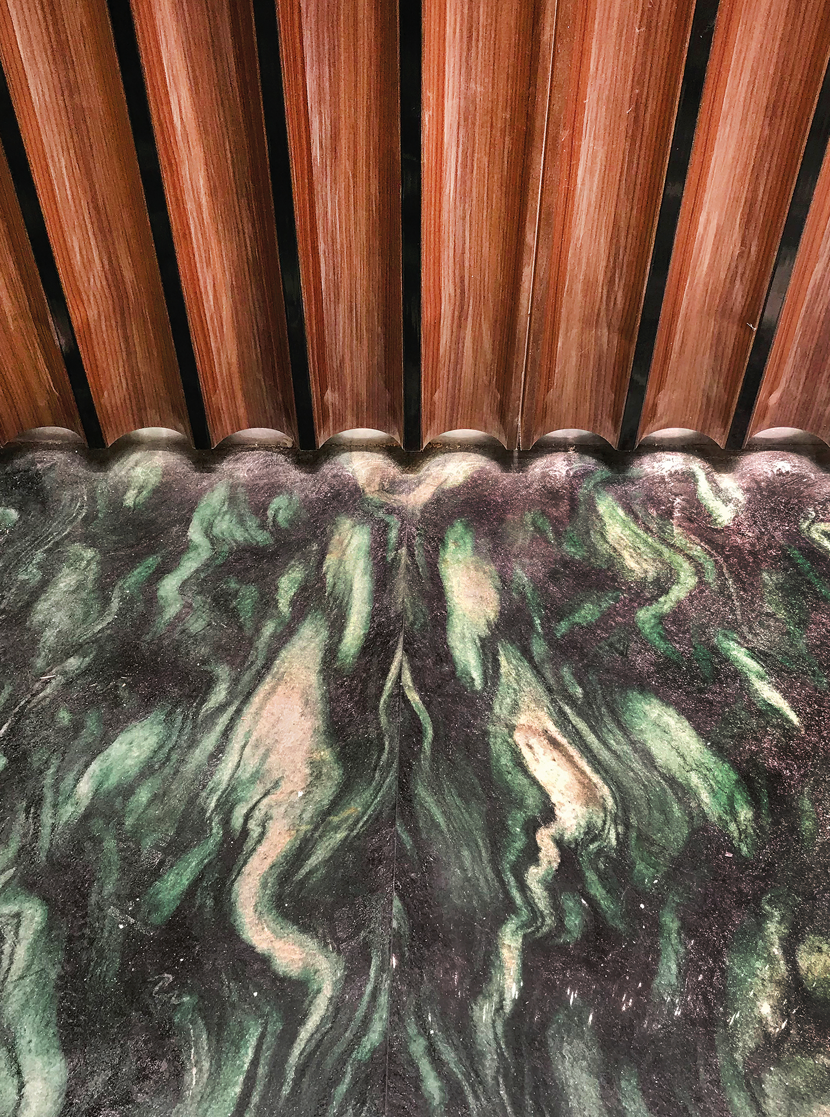 Depuis l’entrée, les visiteurs sont entraînés vers la Grande Salle, longue de 22 mètres, haute de 6 et coiffée de deux dômes parés de mosaïques en pierre taillées à la main dans un dégradé de couleurs. Les murs de cet espace à l’échelle du «Vatican» sont en béton brut, et ponctué de panneaux de soie moirés recouverts de verre dans un rouge cardinal lumineux. Le sol en pierre est un chef-d’œuvre de l’artisanat italien. 15 types de marbres différents s’associent géométriquement dans une gamme de couleurs allant du jaune intense au rouge, en passant par l’ivoire et les crèmes et blanc nacré, le bleu, les noirs et gris intensément veinés.