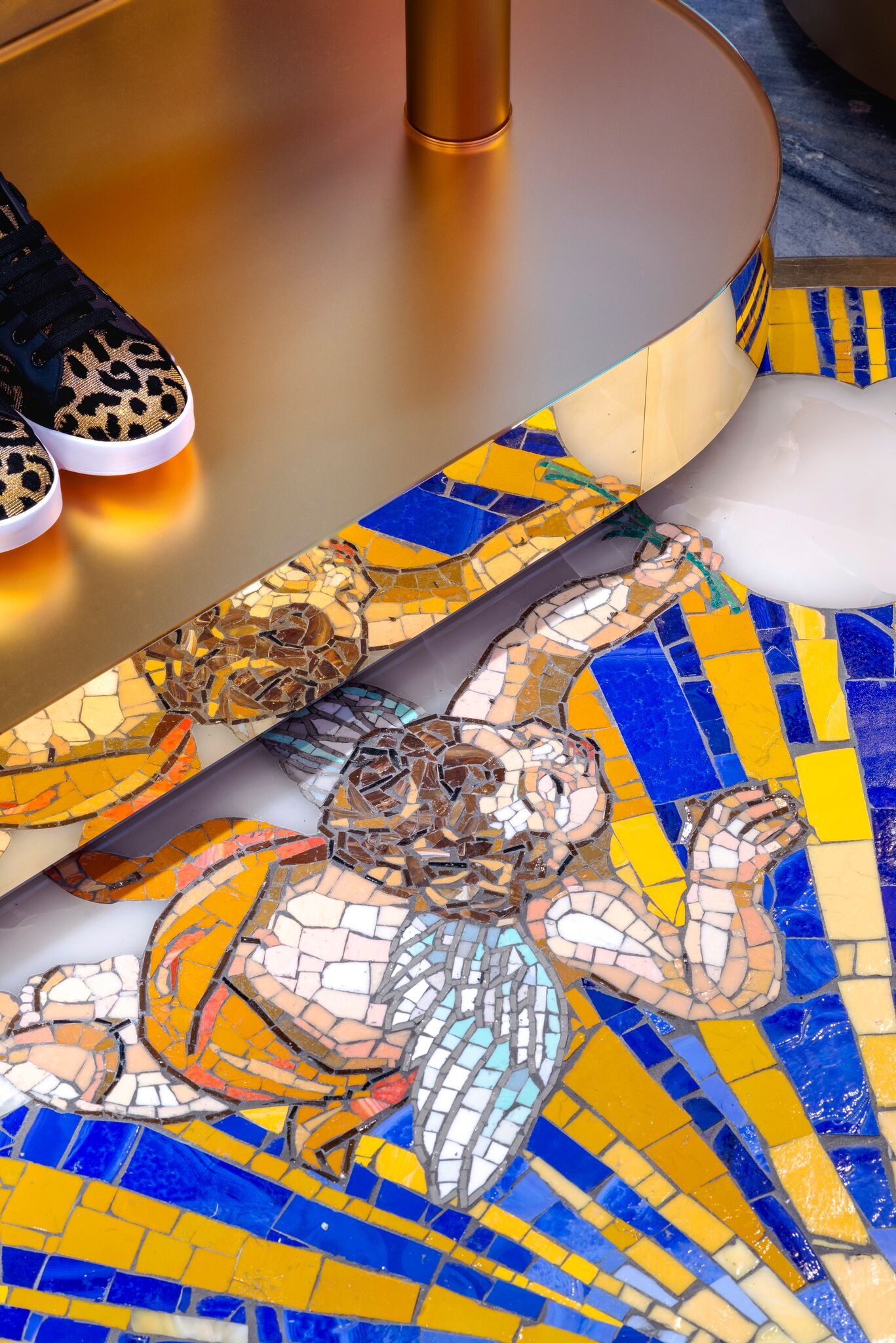 À l’entrée, Eric Carlson inaugure l’expérience selon la technique baroque de la 'perspective accélérée', illusion magique qui déforme la perception de la profondeur, inspirée par la colonnade de Francesco Borromini au Palazzo Spada. Trois espaces contigus diminuent proportionnellement en taille, diamètre de colonne et motifs au sol pour créer une illusion augmentée de profondeur. Même les lustres éclatants en verre de Murano soufflés à la main, rouges et dorés, ont été conçus sur mesure à trois échelles différentes pour accentuer l’effet.