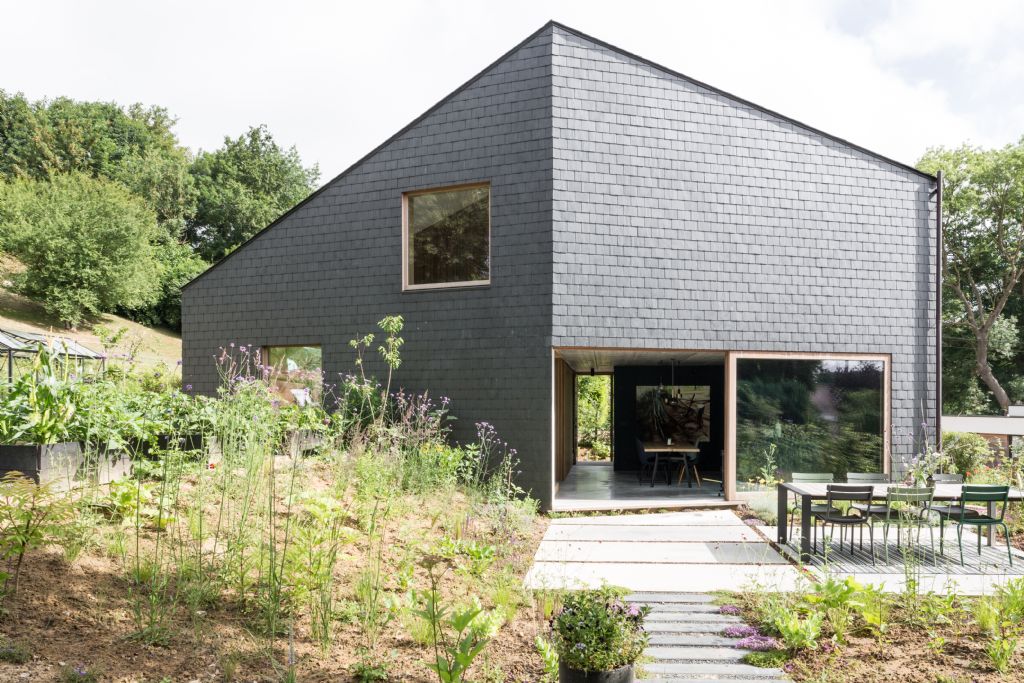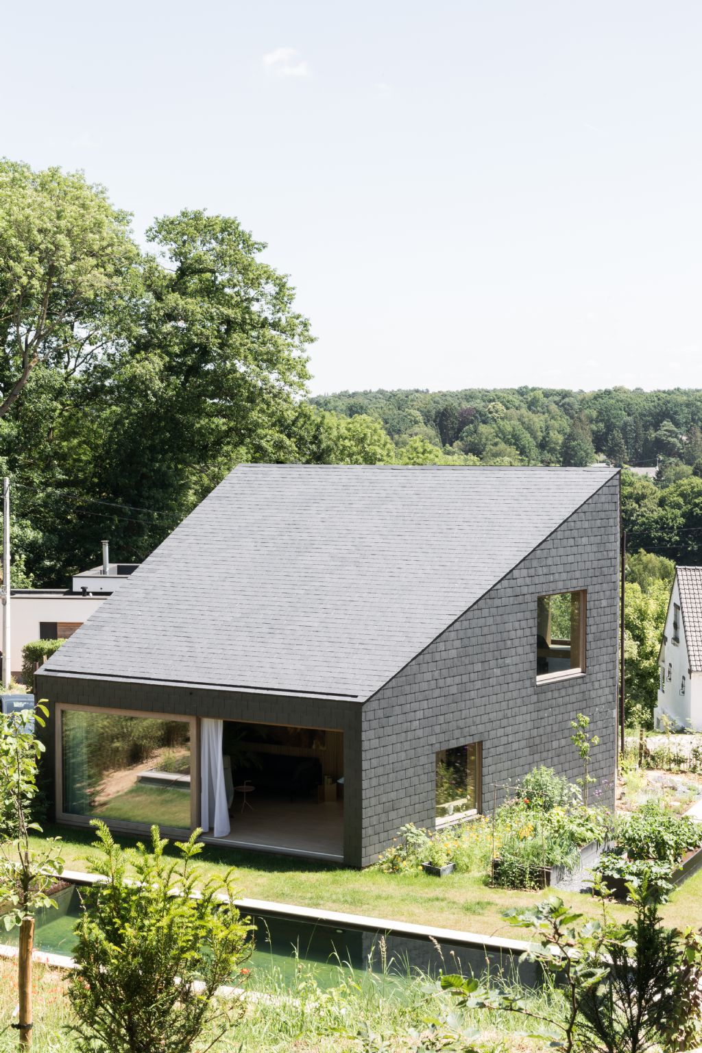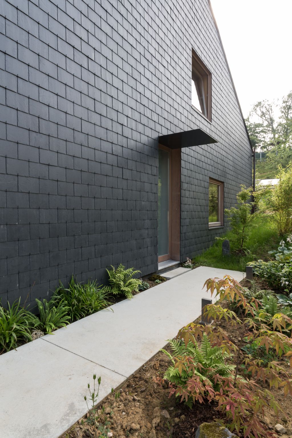 Dans le cadre de ce projet où la question du paysage et de la nature sont centraux, les architectes proposent de limiter l’impact paysager de l’habitation en lui conférant une teinte foncée. En effet, au contraire du blanc qui amplifie significativement la lumière, le noir ou les couleurs foncées absorbent la lumière de sorte qu’une maison foncée se fondra d’autant plus efficacement dans le paysage qu’une maison blanche. Cette teinte foncée est rencontrée grâce à l’emploi d’un bardage en ardoise naturelle. Ce matériau présente également un avantage indéniable dans notre souhait de fondre la maison dans le paysage : il est également utilisable pour la réalisation de la toiture. De ce fait, la maison est un monolithe pur et intégré du point de vue paysager.