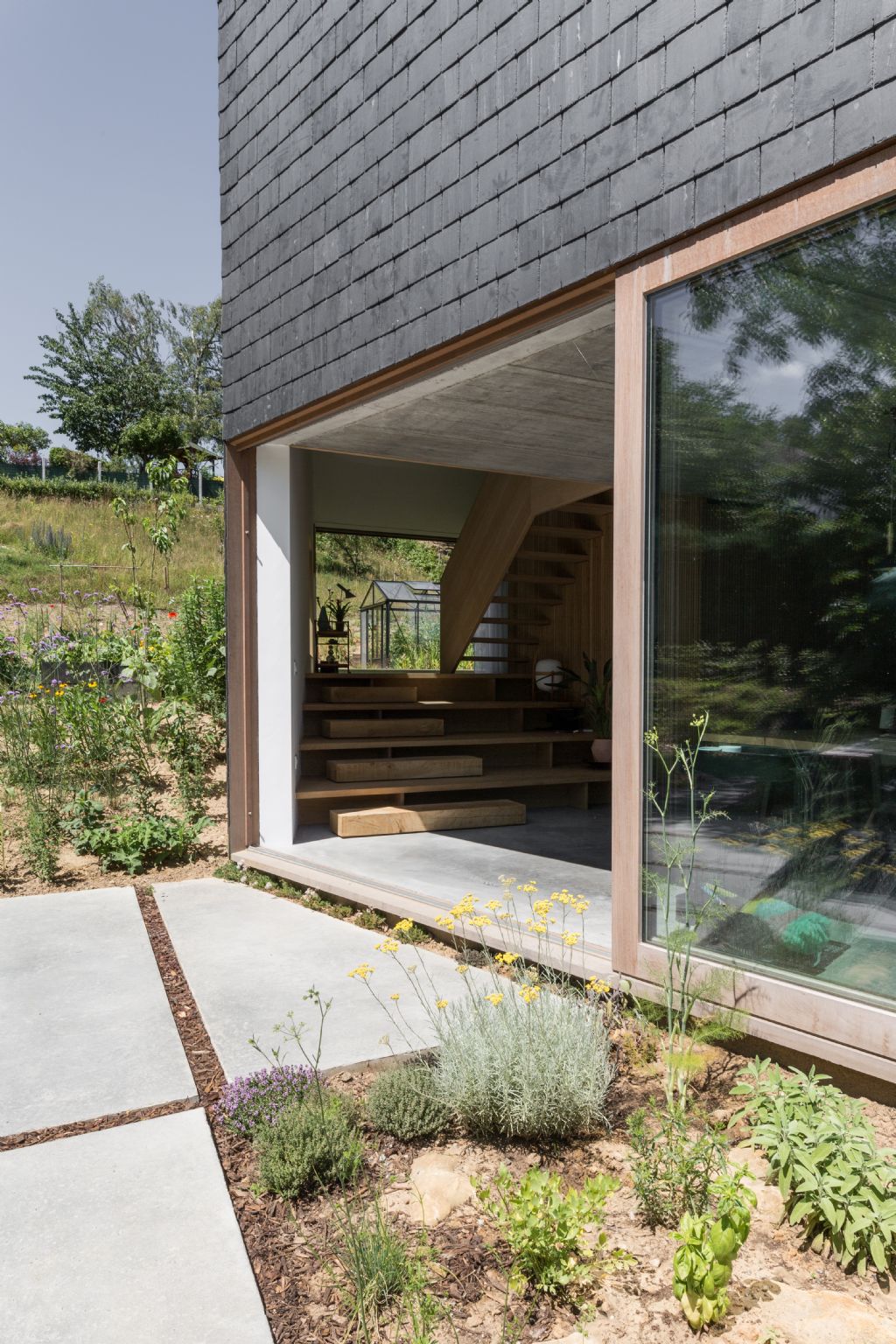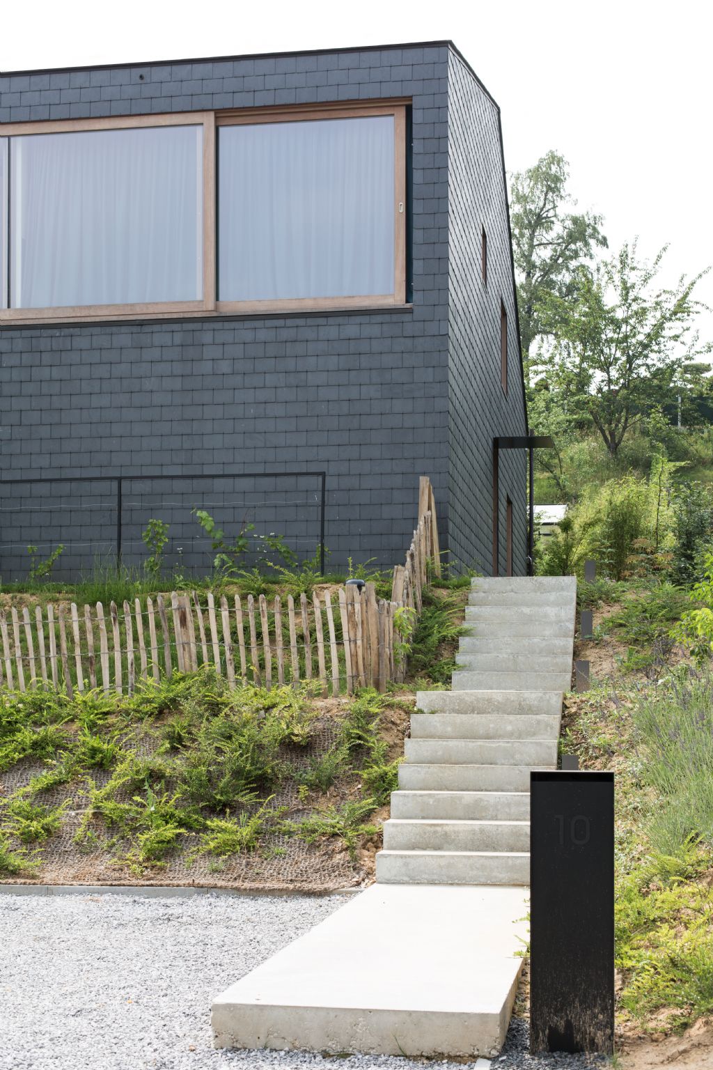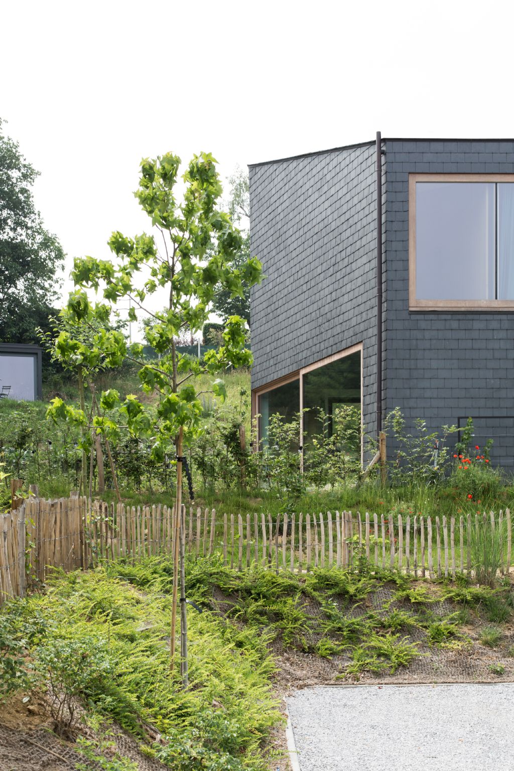 Dans ce projet, les architectes souhaitent profiter un maximum de la parcelle. Y installer la maison au centre afin de garantir l’intimité vis-à-vis du voisin, d’offrir un rapport maximal avec le jardin et de maximiser les apports solaires en ouvrant généreusement la maison suivant la course du soleil. Leur objectif était aussi de faire découvrir le paysage via un parcours ponctué de fenêtres visuelles sur le jardin, la topographie et le paysage. Ils s’agissait de profiter de la topographie pour créer une spatialité riche en demi-niveau en suivant la pente naturelle. Le terrain a été séquencé en différents espaces suivant le relief : zone d’entrée, zone boisée participant à la végétalisation de l’espace public, jardin bas, jardin haut.