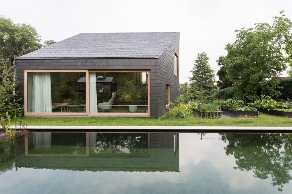 Le jardin est architecturé par des talus et des surfaces de terrasse. En lien avec la cuisine et la salle à manger, on retrouve la terrasse pour manger et les plantations d’herbes aromatiques. Au niveau du salon, la surface plane accueille la piscine naturelle et le potager. Sur le dernier talus, le jardin est plus sauvage et est ponctué par quelques arbres fruitiers.