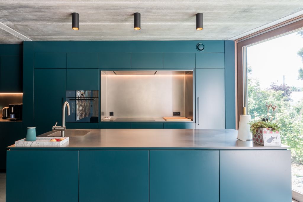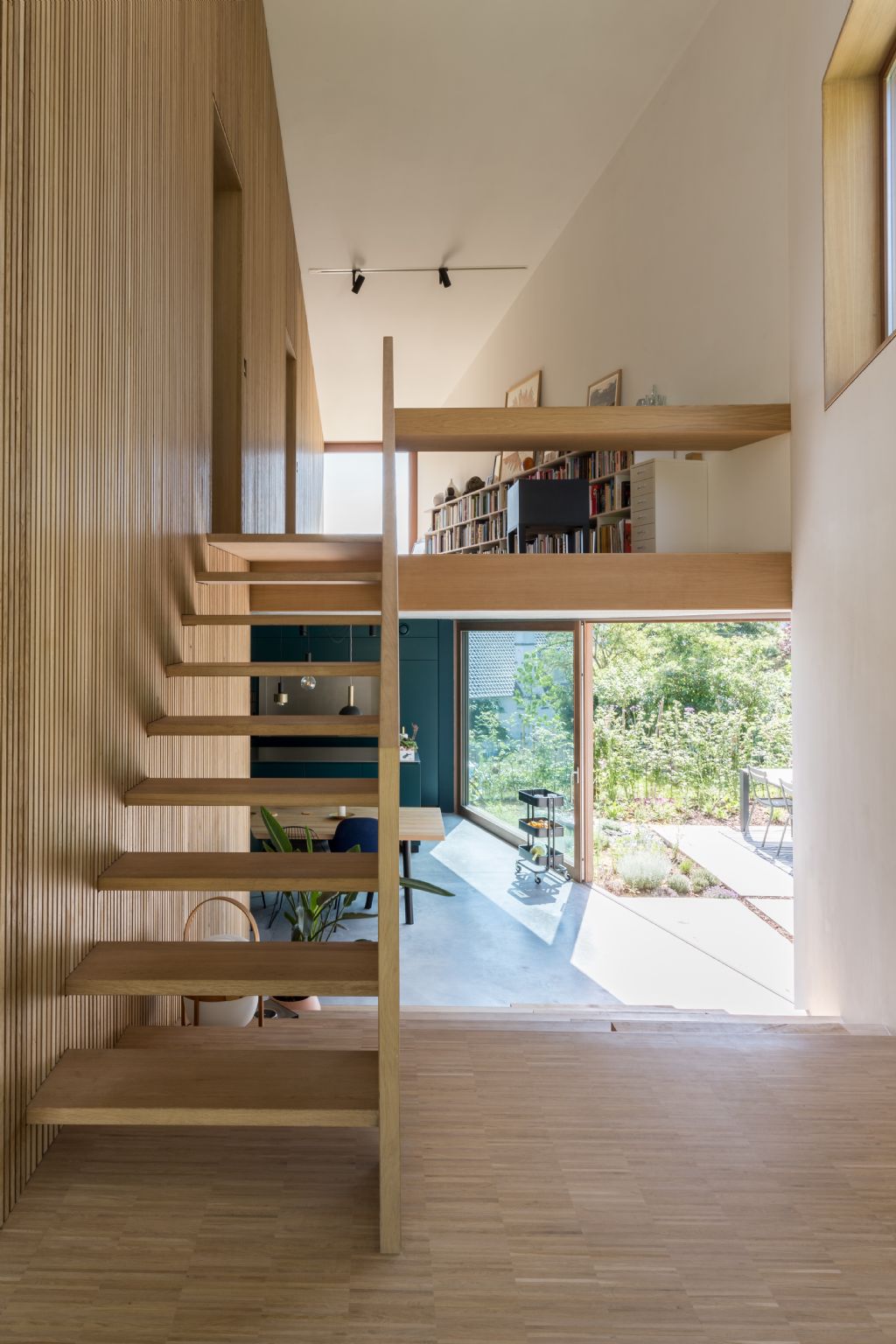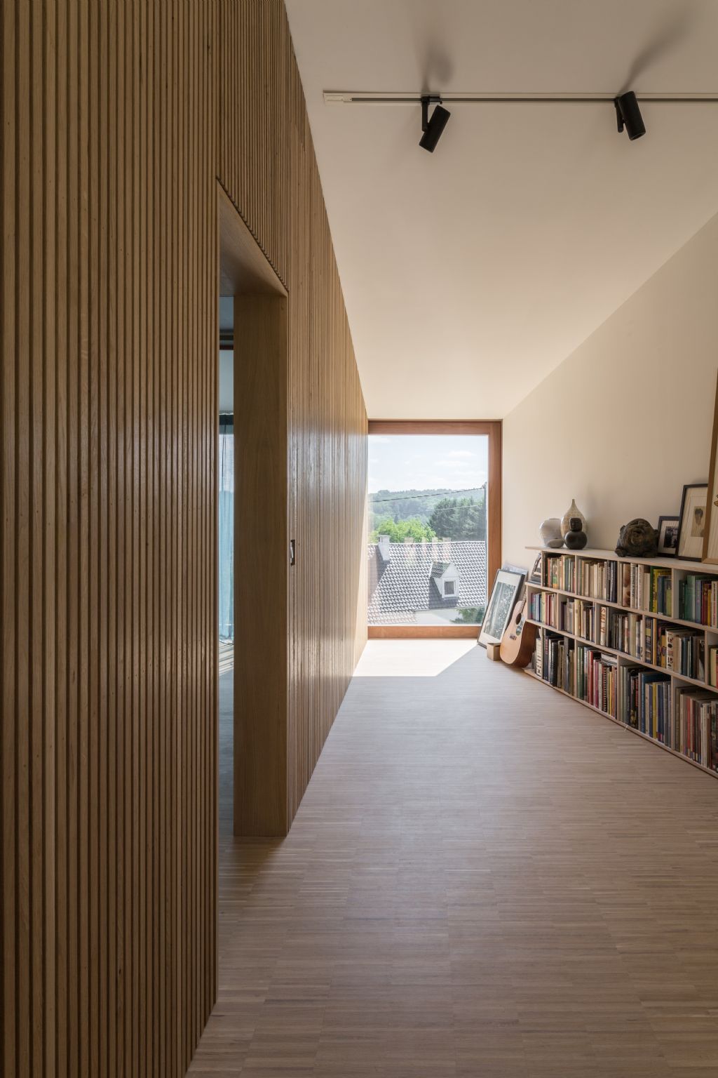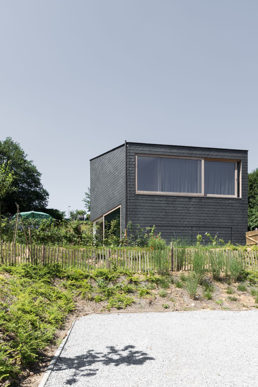 Les façades Est, Sud et Ouest de la maison présentent chacune une grande ouverture sur l’extérieur. De cette manière, la cuisine et la salle à manger s’ouvrent généreusement sur le jardin, le salon est mis en relation avec la topographie car ouvert sur le talus qui grimpe vers le haut de la parcelle. A l’étage, la chambre et l’espace polyvalent bénéficient d’une vue cadrée sur le paysage. D’autres fenêtres au format carré sont ajoutées à certains endroits pour offrir un apport de lumière plus ponctuel ainsi qu’une vue supplémentaire sur l’extérieur.