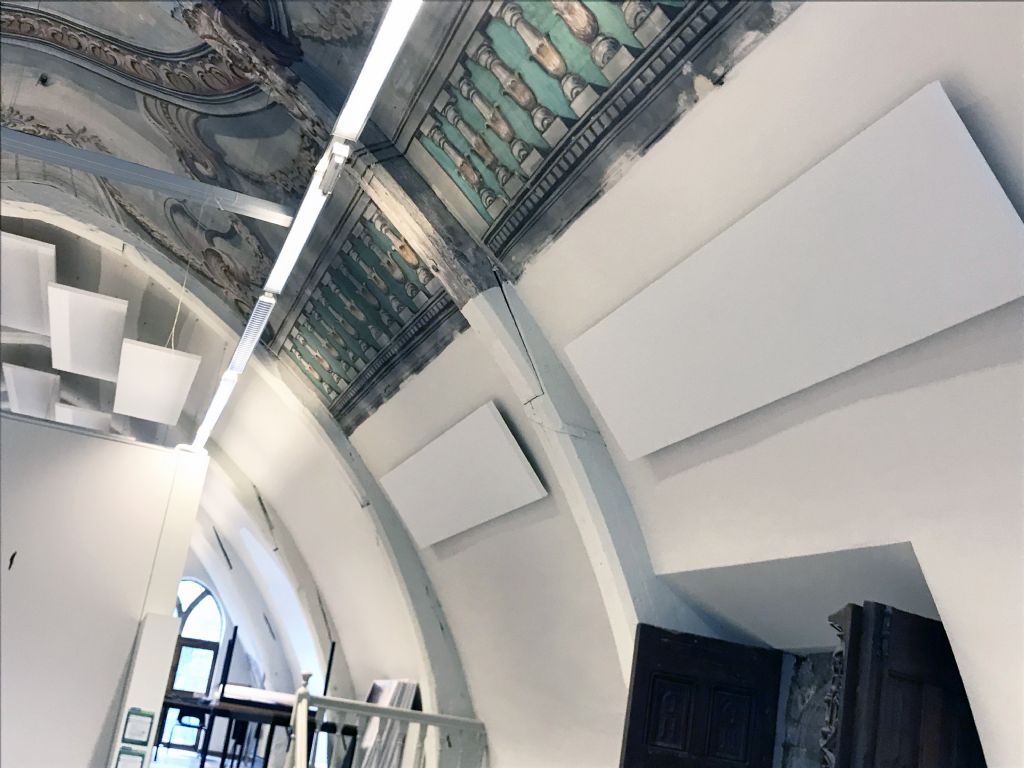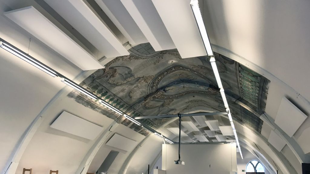 - La salle dispose de plusieurs fresques au plafond qui ont été récemment restaurées. Les panneaux acoustiques devaient être placés de manière à ne pas endommager ou cacher les fresques.