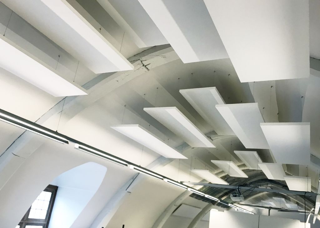 Sur le mur, Dox Acoustics a opté pour des oeillets afin que les panneaux restent amovibles et à une distance minimale du mur pour ne pas les abîmer. Les oeillets sont également idéaux pour une surface légèrement en pente. Sous le plafond incurvé, les panneaux ont été suspendus en chevauchement sur des câbles réglables en longueur. Cela garantit une flexibilité dans la mise en place ainsi que des dommages minimes. L'effet dimensionnel est également beau et s'intègre parfaitement au caractère de la pièce.