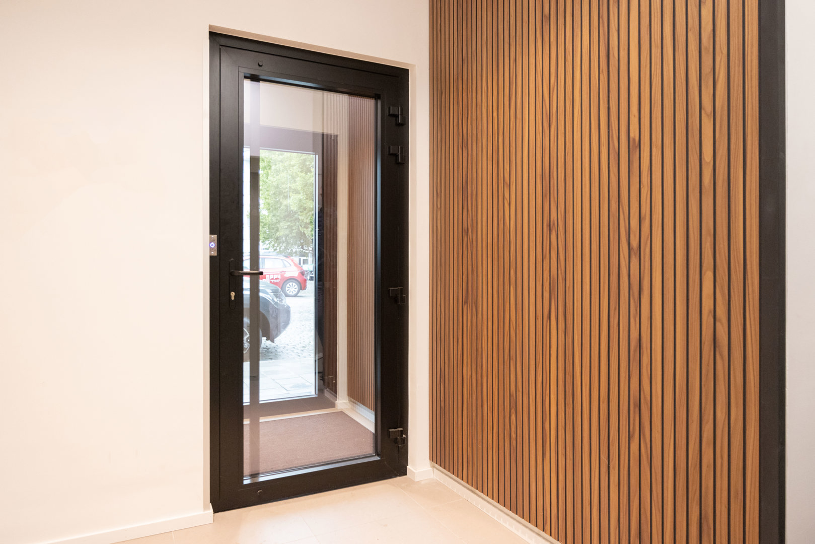 Pour ce bâtiment, un choix délibéré a été fait en faveur d’une combinaison d’aluminium et de PVC. Au rez-de-chaussée, dédié aux fonctions commerciales, des profilés de fenêtres en aluminium Decalu ont été mis en œuvre. Aux étages supérieurs, destinés au logement, des profilés en PVC issus de la gamme Elegant ont été utilisés. Cette approche hybride aboutit à une façade cohérente, avec des profilés élancés et une expression homogène, tout en répondant aux exigences fonctionnelles propres à chaque niveau.