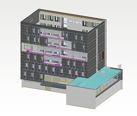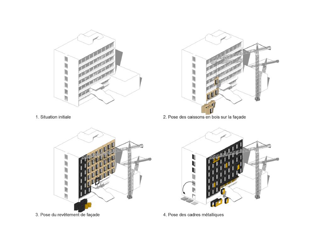 Un nouveau système de ventilation double flux avec récupération de chaleur a été installé entre l’ancienne et la nouvelle façade, lors de l’installation et du montage des éléments en ossature bois. Quant à l’isolant utilisé, il s’agit de laine de roche, conformément aux exigences des pompiers. Avec la nouvelle enveloppe performante, ce système permettra de réduire drastiquement la consommation d’énergie. Enfin, des pare-soleil jaunes ont été posés sur place, et non pas en usine, afin d’éviter les risques d’endommagement lors du transport.