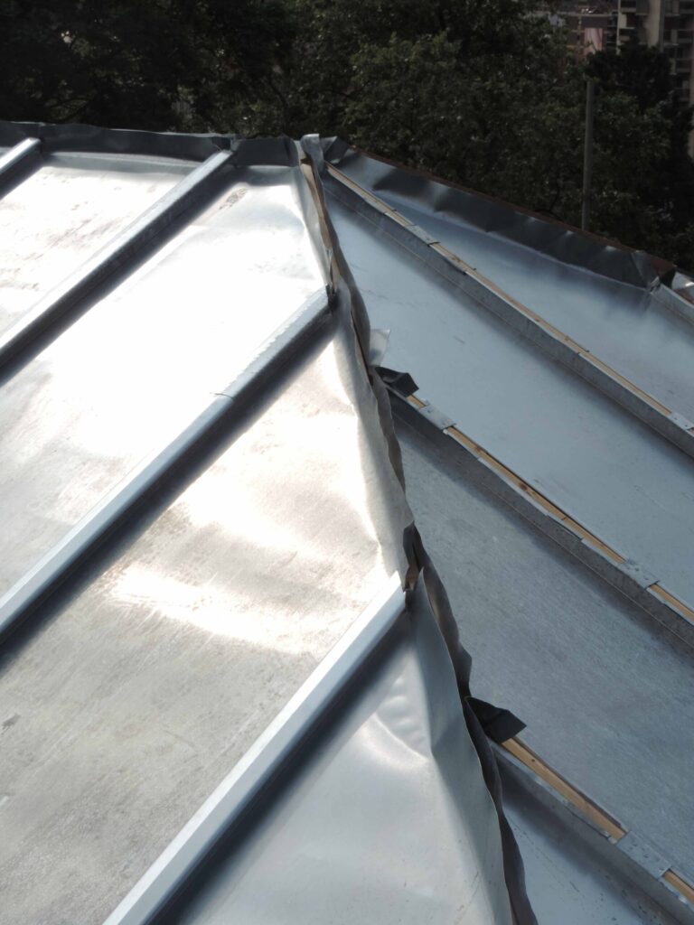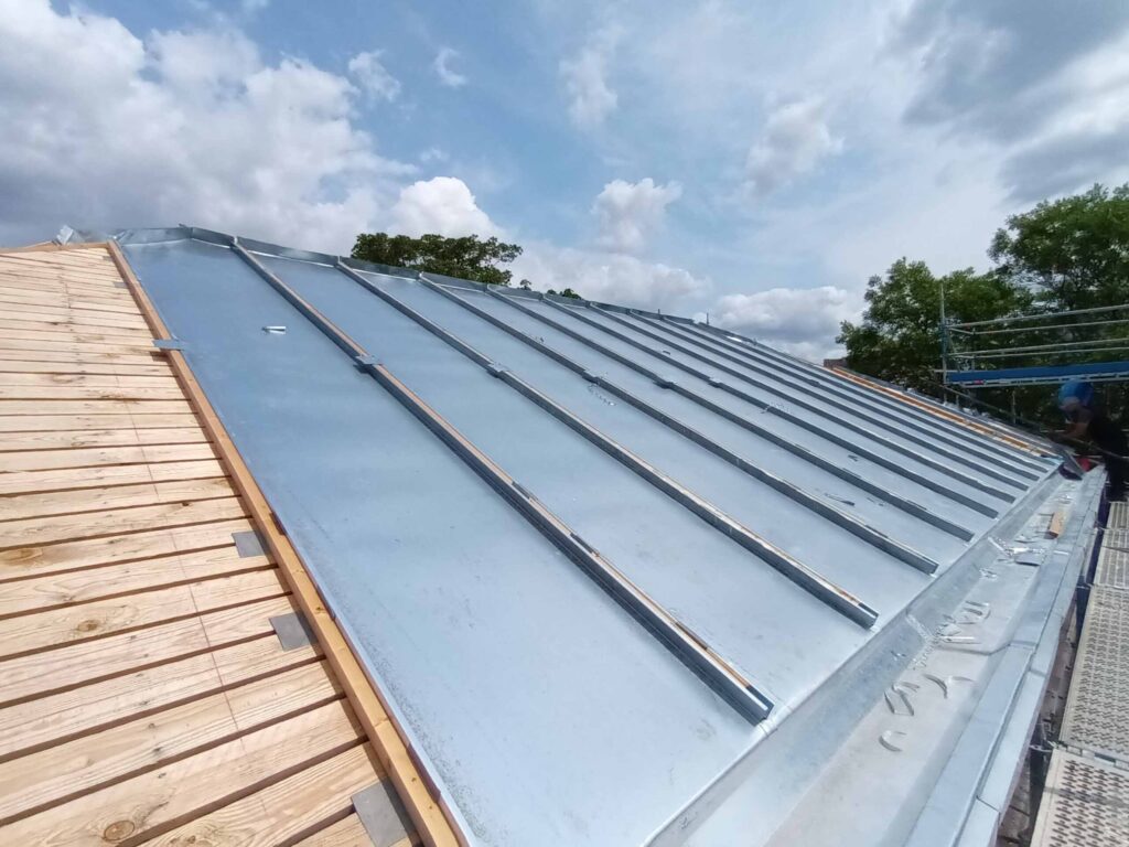 Afin de préserver l’aspect originel du bâtiment, il a été décidé de remettre une toiture en zinc à tasseaux. Précurseur du joint debout, ce système, composé de plaques de zinc à bords relevés séparées par des tasseaux en bois, se retrouve principalement dans les bâtiments plus anciens. L’étanchéité de la finition entre les plaques et les tasseaux est assurée au moyen de couvre-joints en zinc.