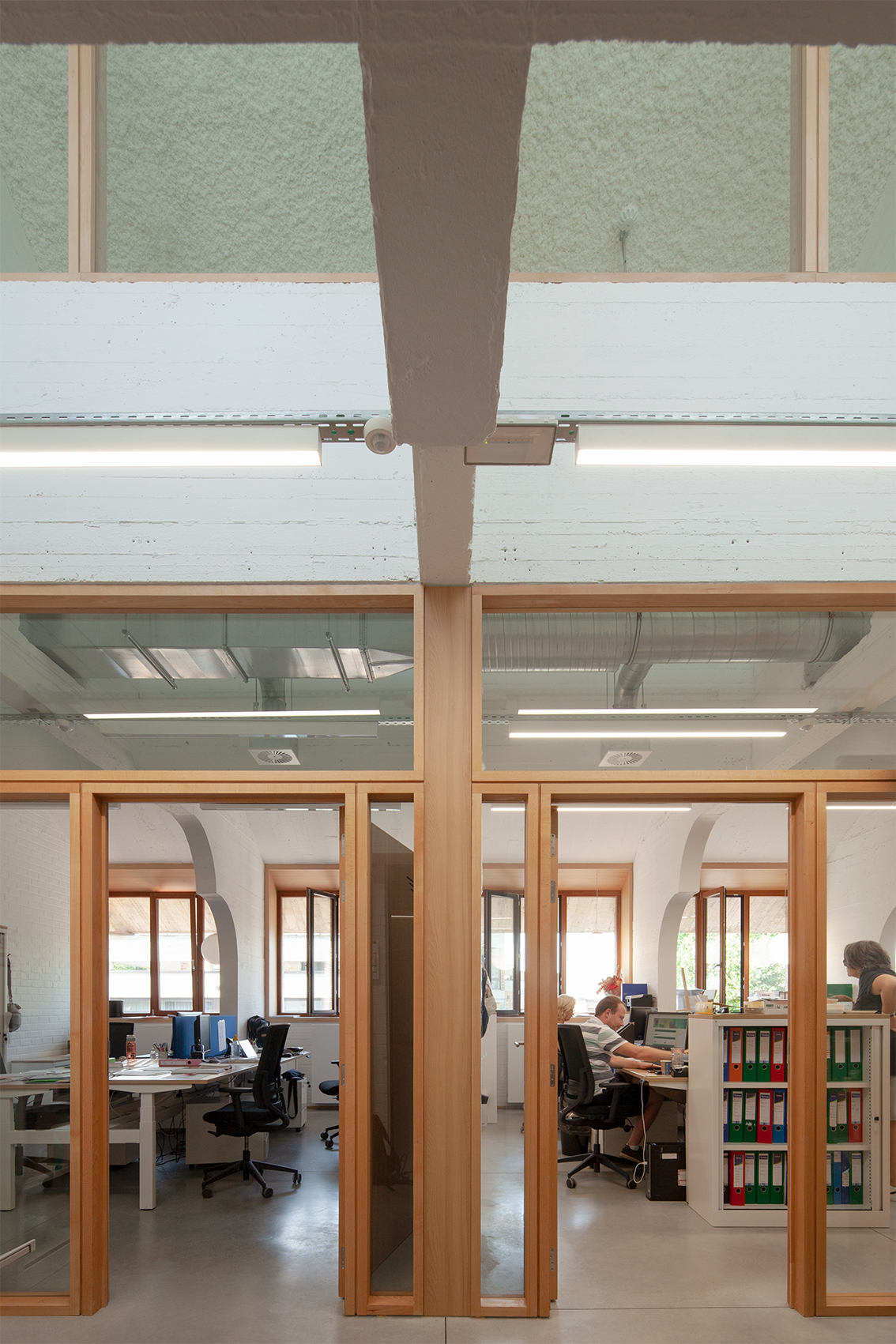 La première tâche a consisté à démonter le bâtiment pour le mettre à nu : récupération du béton qui pouvait l'être, restauration de la maçonnerie d'origine, conservation des menuiseries et des charpentes.