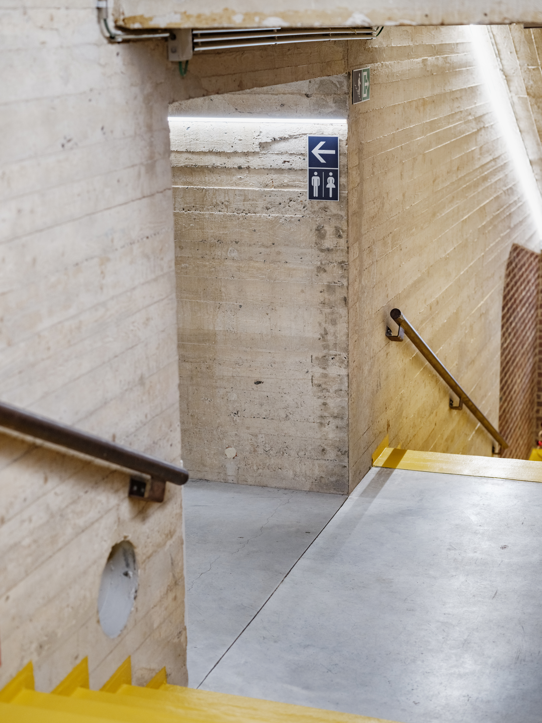 Les volumes sont décloisonnés tant sur le plan fonctionnel que spatial. La hauteur exceptionnelle de la toiture et le jeu des poutres et de la lumière tombant à travers les briques de verre sont retrouvés. L'objectif de la stratégie de rénovation est de restaurer le bâtiment dans son état originel, tout en le dotant de la technologie et du confort thermique nécessaires à la prochaine étape de son cycle de vie. Conformément à notre vision de la rénovation, nous n'intervenons que sur les murs déjà modifiés. La façade Est est la seule façade que nous adaptons, afin d'augmenter la continuité spatiale au rez-dechaussée.