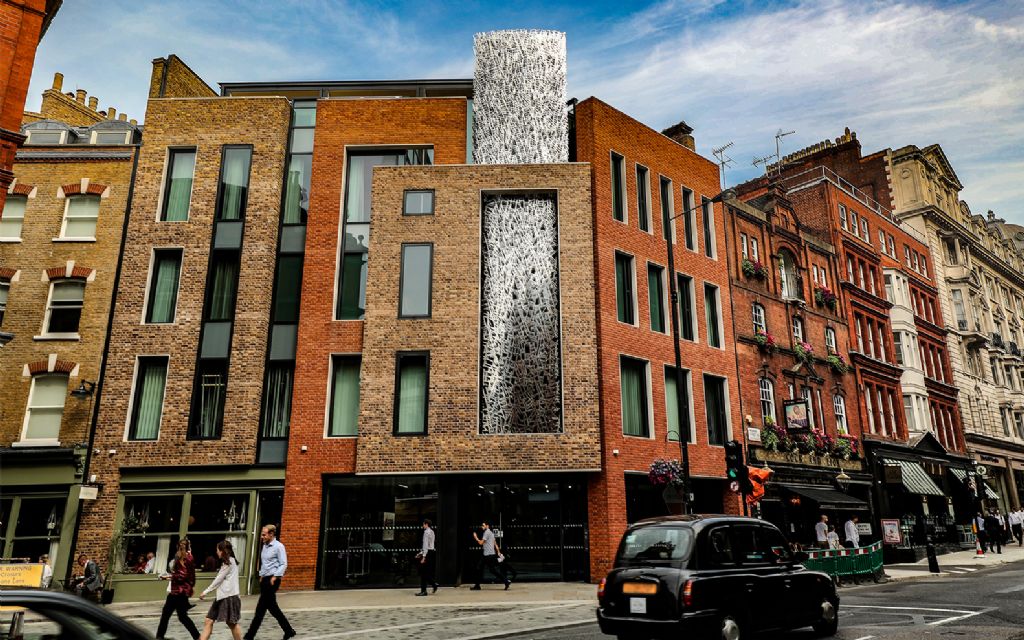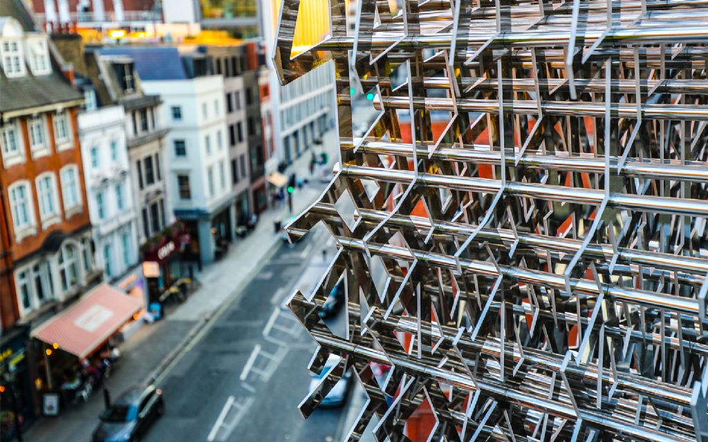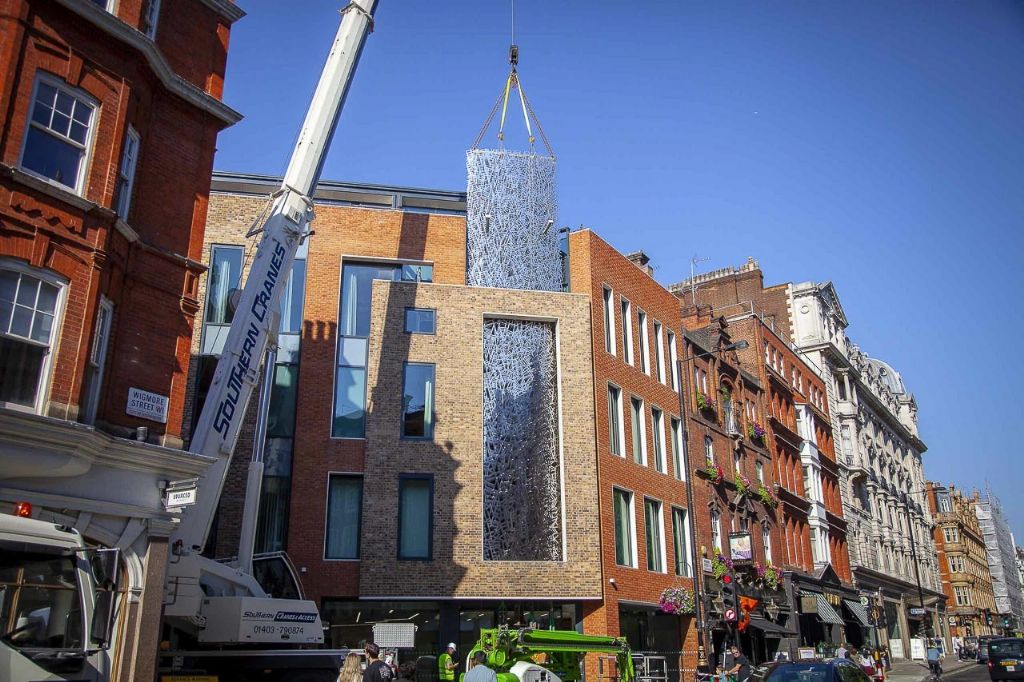Une œuvre d'art en acier prend place dans une façade londonienne