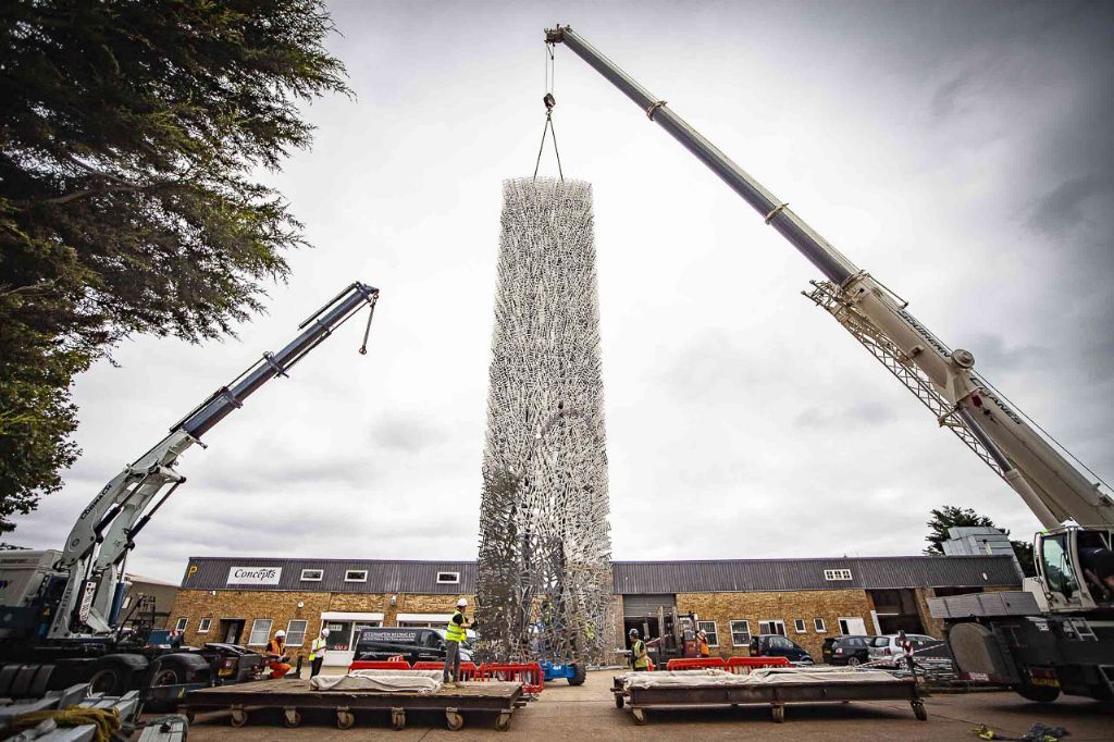 Format Engineers a travaillé avec l'entreprise Littlehampton Welding pour réaliser la structure. De fines plaques d'acier ont été assemblées grâce à 1 200 tiges d'acier inoxydable, ce qui a permis de créer une légère courbure.