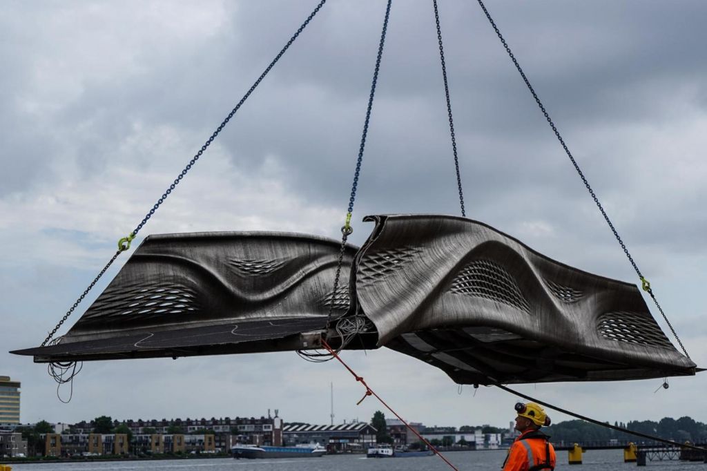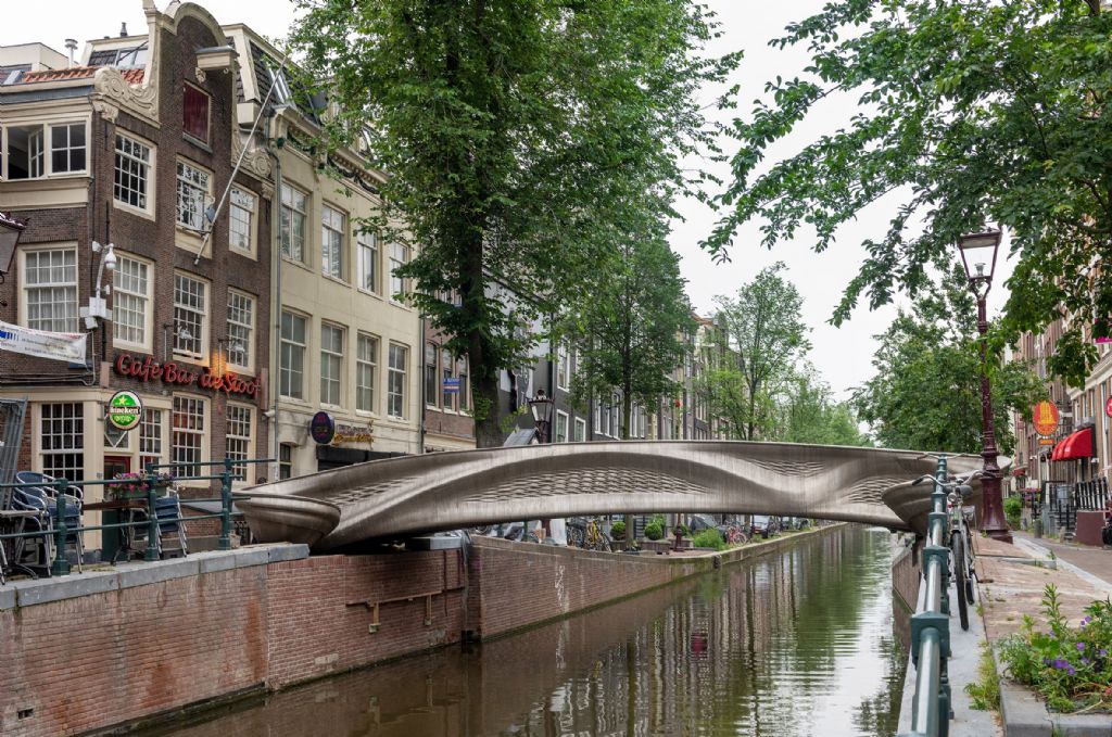 Une passerelle piétonne de 12,5 mètres de long, imprimée en 3D, conçue par le designer hollandais Joris Laarman et construite par la société néerlandaise de robotique MX3D, a été inaugurée six ans après le lancement du projet. L’ouvrage, fabriqué par des bras robotiques à six axes équipés de matériel de soudage, enjambe l'Oudezijds Achterburgwal dans le quartier rouge d'Amsterdam.
