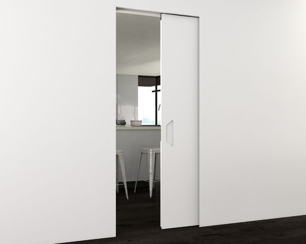 Quand on l’ouvre, la porte disparait dans le mur : un gain de place qui caractérise toutes les portes Argenta. La fente visible dans le mur lorsque la porte coulissante est fermée est dissimulée par un profilé mobile.