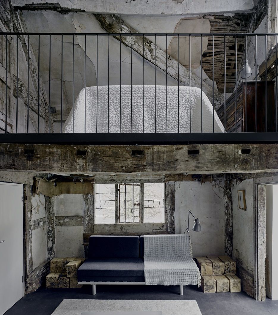 La stratégie adoptée par les architectes n'a pas été de restaurer ou de rénover le bâtiment vieux de 300 ans mais de le conserver en l'emballant dans une nouvelle enveloppe très performante. Ce qui veut dire que l'on a souvent deux toitures et deux murs, les anciens et les nouveaux. La ruine a été intégralement préservée, y compris le lierre, un nid abandonné... et la poussière.