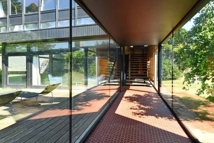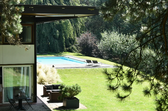 Avec ses 400 m² habitables répartis sur deux étages, cette maison de famille impressionne par ses volumes baignés de lumière grâce à de larges baies vitrées qui ouvrent sur la nature environnante. Conçue à l’origine pour le couple Bardy, elle illustre parfaitement la recherche de transparence et de légèreté qui caractérisait le travail de Dominique-Alexandre Louis, ancien collaborateur de Henri Prouvé et Gaston Schmit.