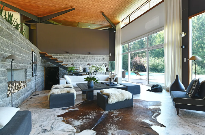 Chaque détail de la demeure reflète une personnalisation méticuleuse, s’adaptant aux goûts et aux besoins de ses propriétaires d’alors : cheminée suspendue, salon de musique, bureau-bibliothèque en mezzanine, le tout dans une ambiance minimaliste et chaleureuse.