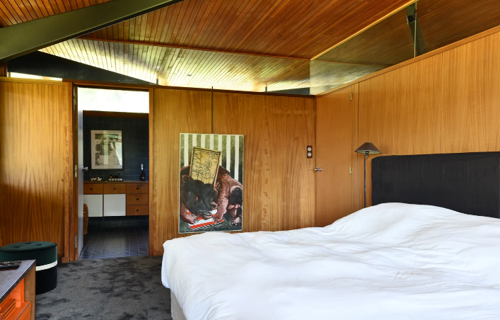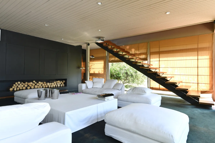 Directement influencée par les Case Study Houses américaines des années 1950, la maison se distingue par sa charpente métallique apparente et ses façades d’origine soigneusement préservées. Cette conception libère les espaces de toute contrainte d’aménagement et confère au lieu une modernité intemporelle.