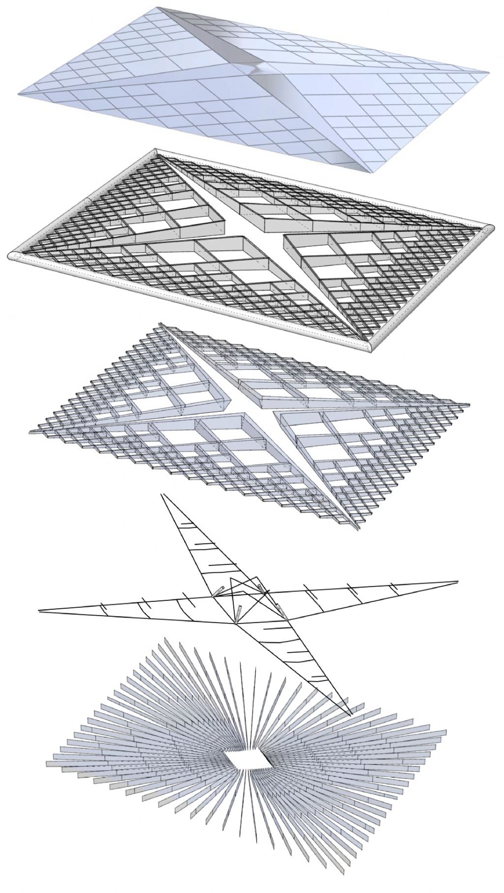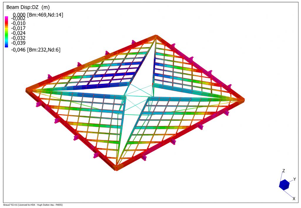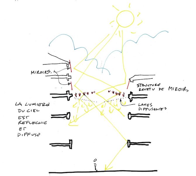 « Les intentions du projet sont, à la manière d’un lustre ou d’un diamant, de collecter la lumière naturelle et de la diffuser. Il s’agit d’intégrer des éléments de réflexion afin d’obtenir des taches lumineuses, discrètes et aléatoires, en s’inspirant des phénomènes d’effets caustiques et de dispersion de la lumière obtenue par la taille des diamants », précise Hugh Dutton.