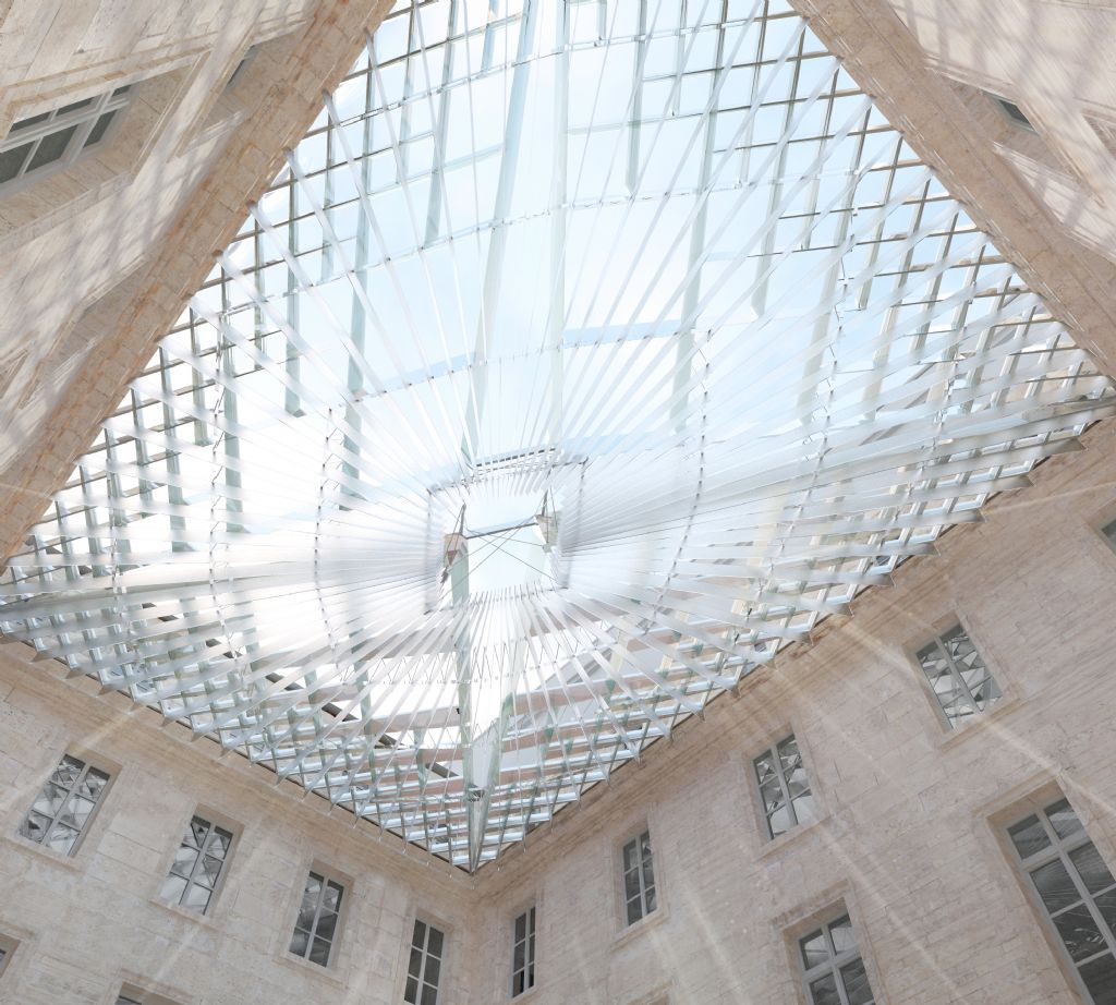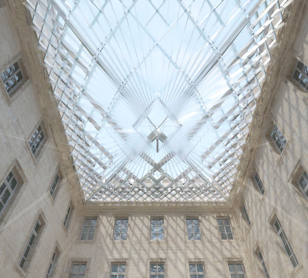 L’architecte d’origine jamaïcaine Hugh Dutton propose d’installer une verrière au-dessus de la cour de l’Intendant de l’Hôtel de la Marine, place de la Concorde à Paris. Une verrière dont la structure est inspirée par l’arcnitecture de la cour et qui est « conçue telle un nuage, légère et immatérielle, survolant la corniche afin de revaloriser les proportions originelles de la cour » selon les mots de l’architecte. Mais également un véritable bijou, un diamant dont les multiples facettes laisseront entrer un véritable bain de lumière naturelle dans la cour intérieure.