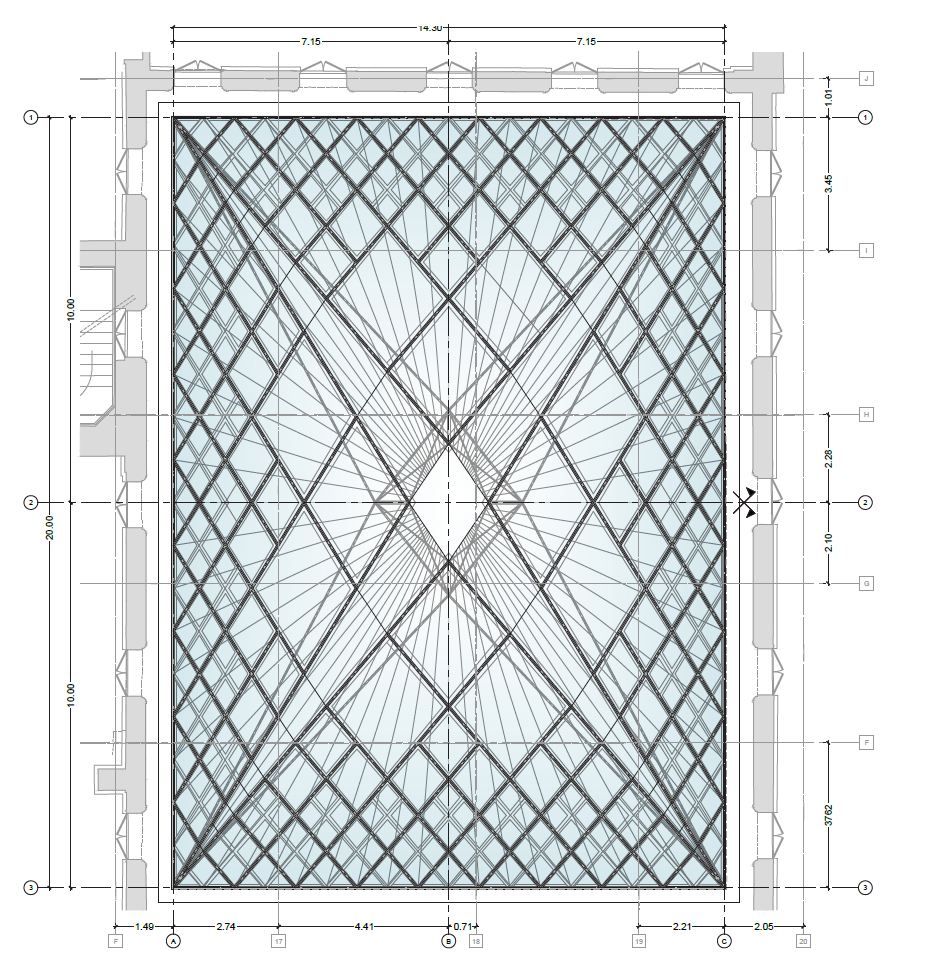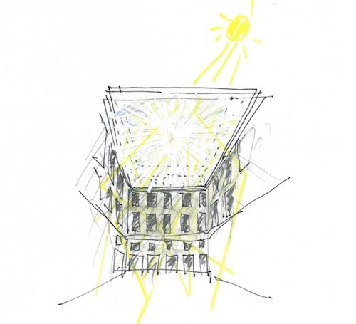 « En hiver », explique l’architecte, « les rayons rasants pénètrent peu dans la Cour, notamment parce qu’ils sont interceptés par les étages ajoutés. La verrière se devait donc d’apporter davantage de luminosité dans cette cour sombre et profonde. »