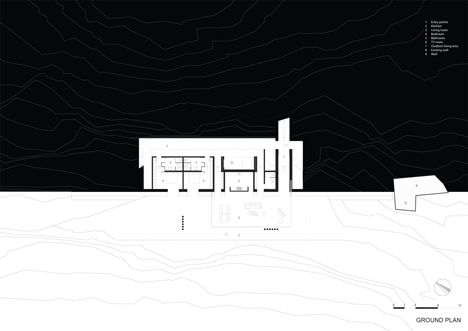 Les visiteurs qui approchent de la maison en empruntant le sentier d'accès, ne découvrent que le toit. L'eau qui s'y trouve relie la maison à la mer, créant une illusion optique. Le bâtiment, sis sur un plateau naturel, est protégé des vents dominants. Il est de plain-pied et possède une superficie de 198 m².