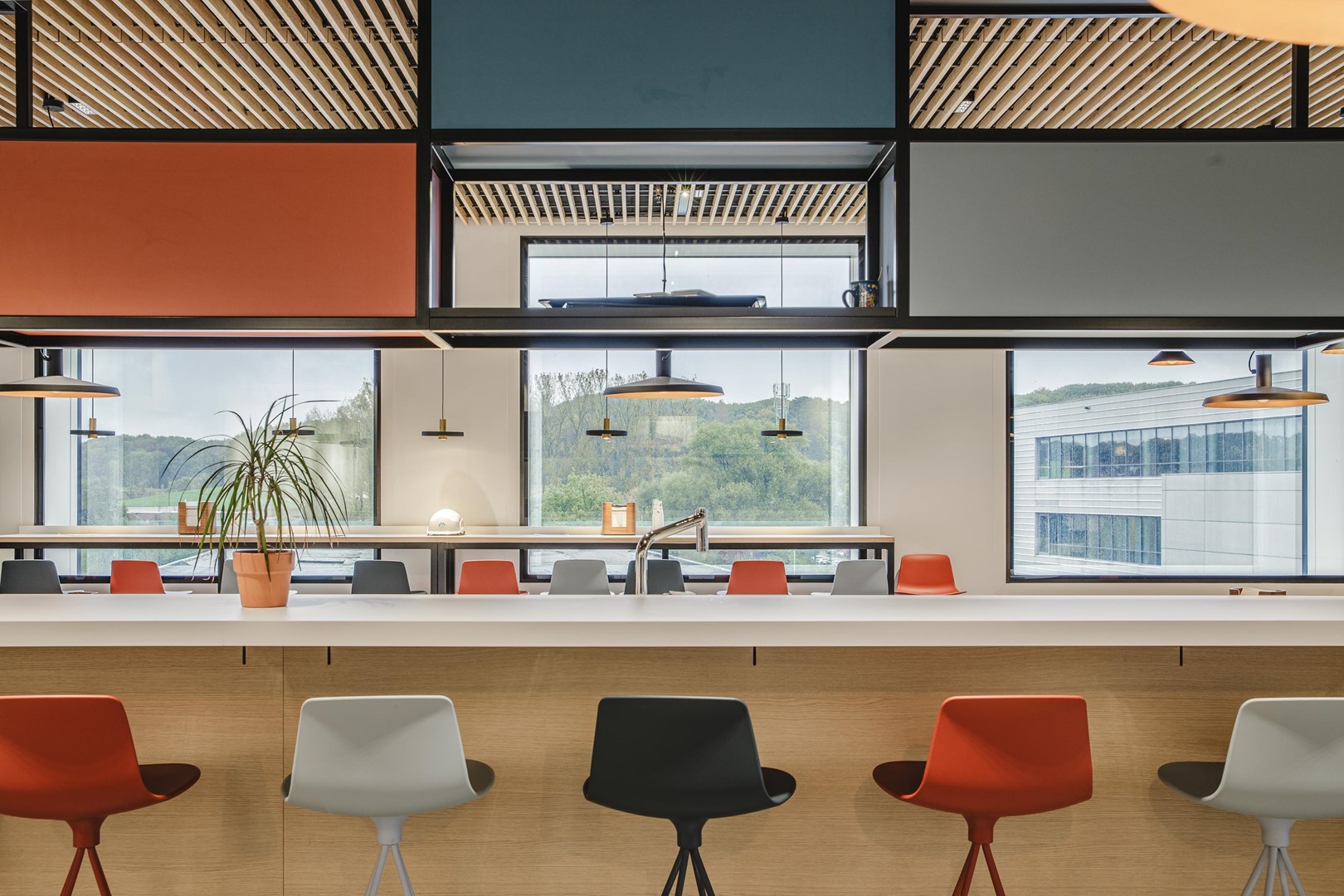 La façade du bâtiment B7, conçue par Assar Architects, est un exemple parfait de cette recherche d'innovation. Composée d'un soubassement minéral foncé et d'une structure entièrement vitrée, elle offre une esthétique moderne et épurée, tout en garantissant des performances énergétiques optimales. La peau extérieure, réalisée sans aucun profil de fixation mécanique visible, représente une prouesse technique. Grâce à une grille en aluminium tubulaire suspendue à la structure du bâtiment, des panneaux de vitrages, soit émaillés, soit vision, sont fixés de manière à offrir une façade complètement coplanaire. Cette conception permet non seulement d'optimiser l'entrée de lumière naturelle mais aussi de réduire les besoins énergétiques pour l'éclairage intérieur.