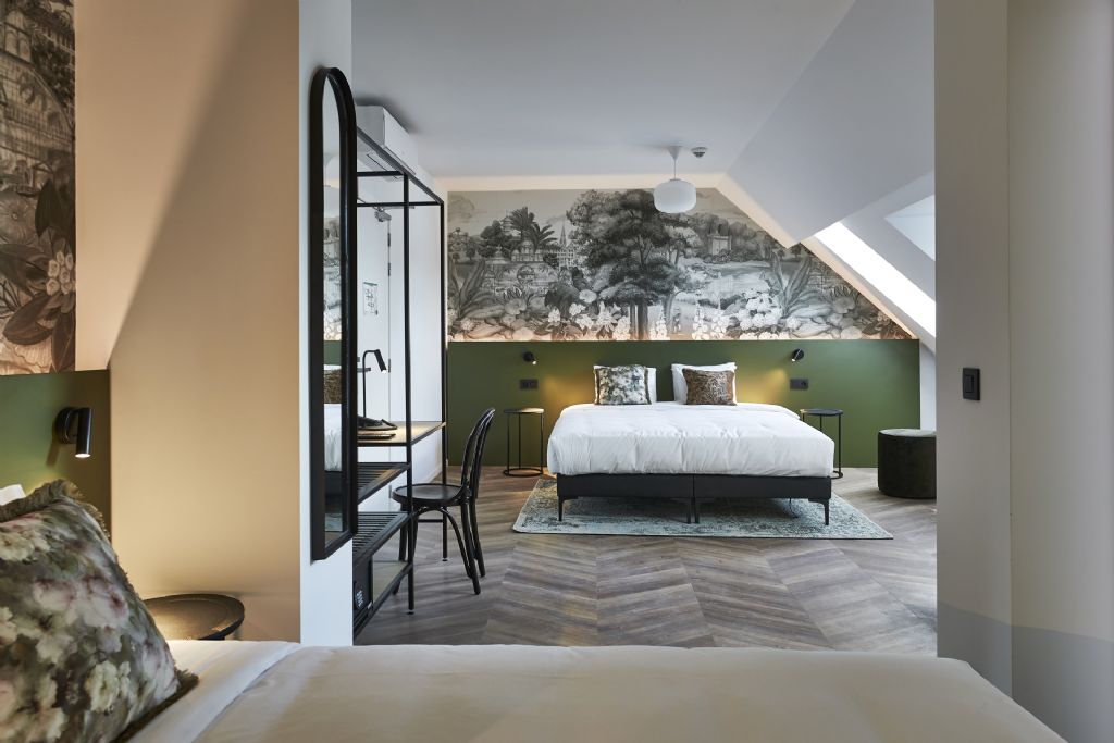 L'architecte d'intérieur a créé une atmosphère qui rappelle celle d'un jardin d'hiver : chaleureuse, abritée, confortable. Plafonds couverts de plantes, éléments naturels dans des endroits surprenants, couleurs rappelant la forêt : Michel Penneman a laissé libre cours à son imagination et a réussi à enchanter les clients de l'hôtel. Pour ce faire, il a collaboré, entre autres, avec Pascale Risbourg de Zaventem Ateliers. Cette dernière a d'ailleurs conçu un papier peint interactif plein de surprises spécialement pour l'hôtel.