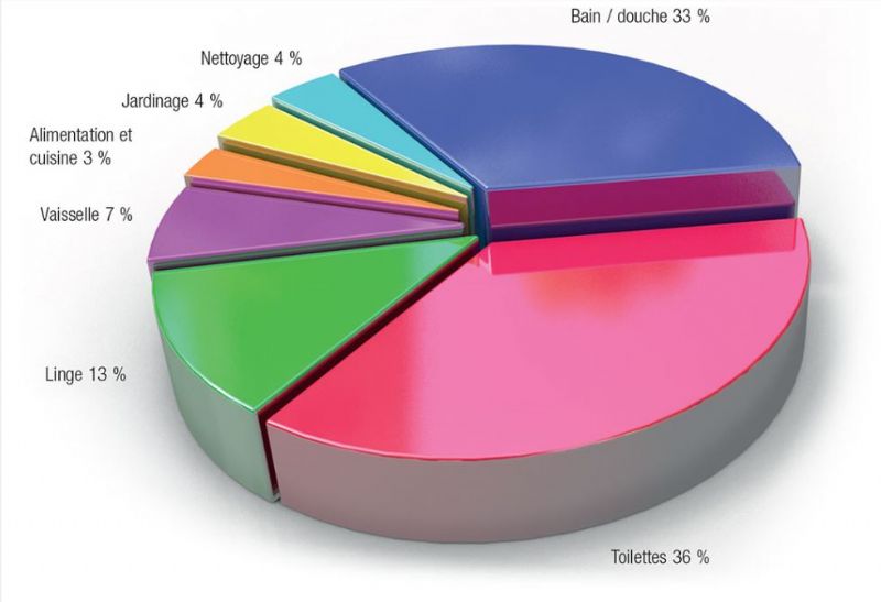 Afin de résoudre ces problèmes, on préconise depuis lors, dans la mesure du possible, de séparer les eaux pluviales de l'égout unitaire et on tente de récupérer et d'utiliser celles-ci dans les bâtiments (voir Les Dossiers du CSTC 2007/1.10). Ainsi, les 50 à 75 m³ d'eau potable qu'une famille de deux à trois personnes consommait en l'an 2000 pour des applications non sanitaires telles que la lessive, le nettoyage, le jardinage et le rinçage des toilettes (voir figure 1) peuvent être couverts par les 80 m³ d'eau de pluie propre disponibles chaque année sur une toiture de 100 m².