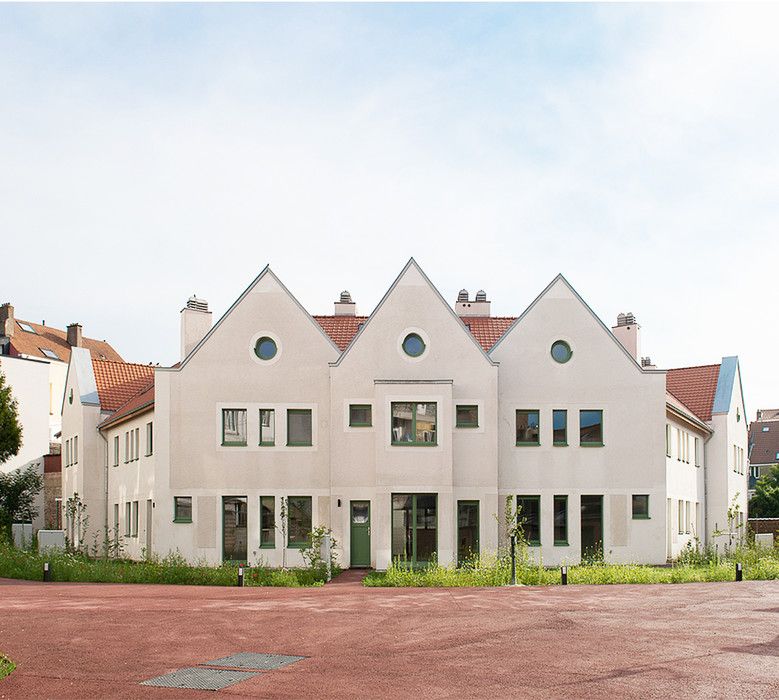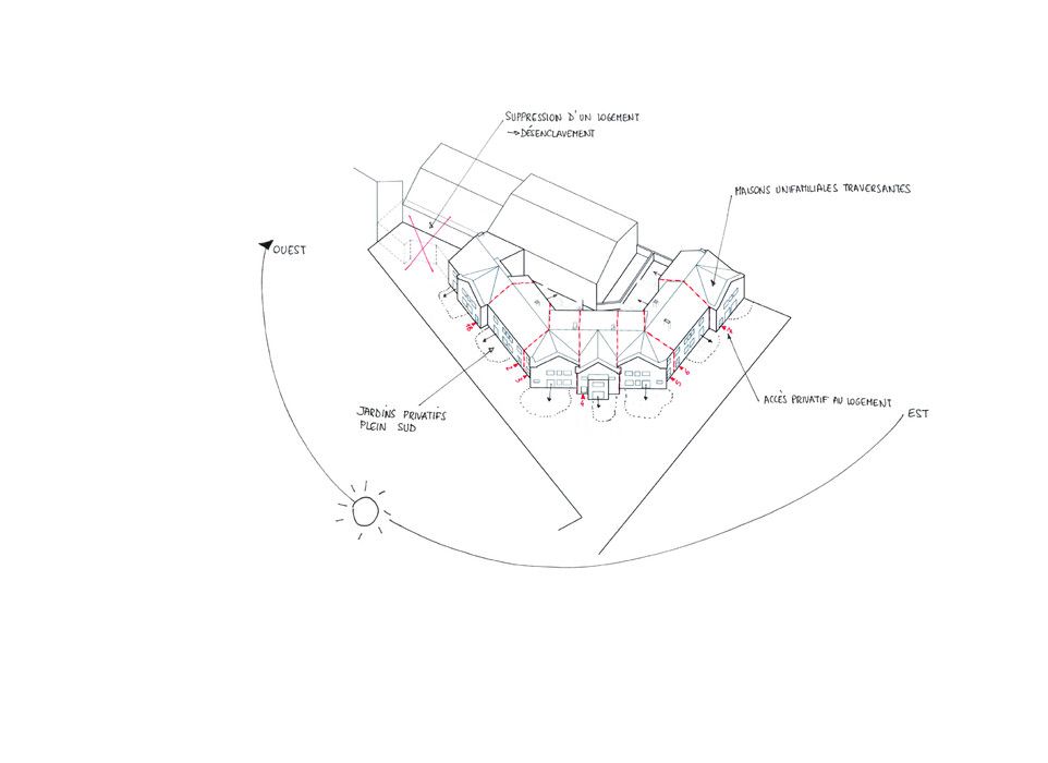 « Le parti pris a été de diviser le bâtiment en une série de maisons unifamiliales mitoyennes traversantes, permettant d'accueillir des familles nombreuses tout en augmentant la densité de l'îlot », expliquent les architectes de Karbon' Architecture et Urbanisme. « Cette approche rationnelle va permettre par la suite une économie d'entretien, de travaux et faciliter la gestion. » Si chaque maison possède une cour et un jardin privatifs, la position centrale de l'espace extérieur de la Cité et son rapport avec le voisinage de l'îlot en font un véritable enjeu du projet. « C'est au travers de points d'activation tels que les potagers, les composts, les pompes à eau manuelles ..., que l'intérieur du site se veut être un lieu fédérateur pour l'îlot, un lieu de vie de qualité, fait d'échanges et de rencontres positives. »
