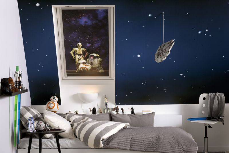 "Star Wars : le réveil de la Force" est non seulement le septième chapitre d'une saga épique, mais fait également entrer la collaboration existante entre Disney et le groupe VELUX dans une nouvelle galaxie. La gamme « Star Wars & VELUX Galactic Night Collection » propose quatre stores occultants galactiques, spécialement conçus pour les chambres d'enfants, afin de stimuler le repos et la créativité, éléments vitaux pour les futures générations et au cœur des priorités du groupe VELUX.