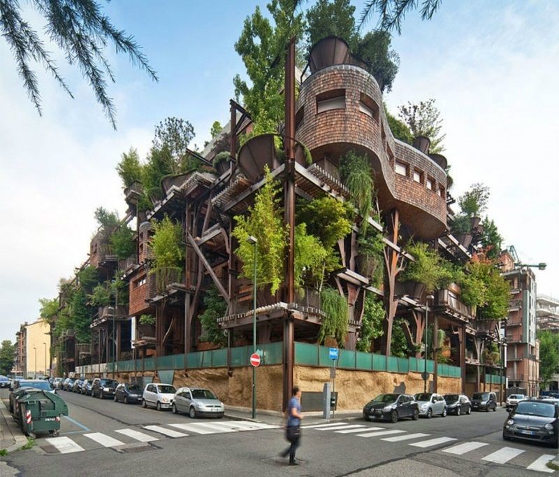 Envie de nature mais sans renoncer à la vie trépidante de la ville ? C'est possible à Turin, où l'architecte Luciano Pia a conçu cet immeuble de cinq étages et 63 appartements. 150 arbres ont été intégrés sur la façade et dans la cour du bâtiment, protégeant les résidents des nuisances sonores et de la pollution émises par les véhicules.