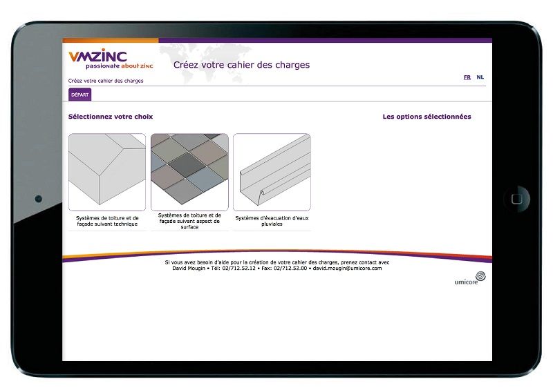 Pour composer facilement et rapidement les cahiers des charges des systèmes en zinc pour toiture, façade ou évacuation d’eaux pluviales, le leader du marché VMZINC propose depuis peu un nouveau module en ligne. Surfez sur www.VMZINC.be, sélectionnez le chapitre ‘toiture’ ou ‘façade’, cliquez à droite sur la case ‘cahier des charges’ et ce nouveau module vous mènera au travers des différentes étapes pour rédiger aisément votre cahier des charges détaillé.