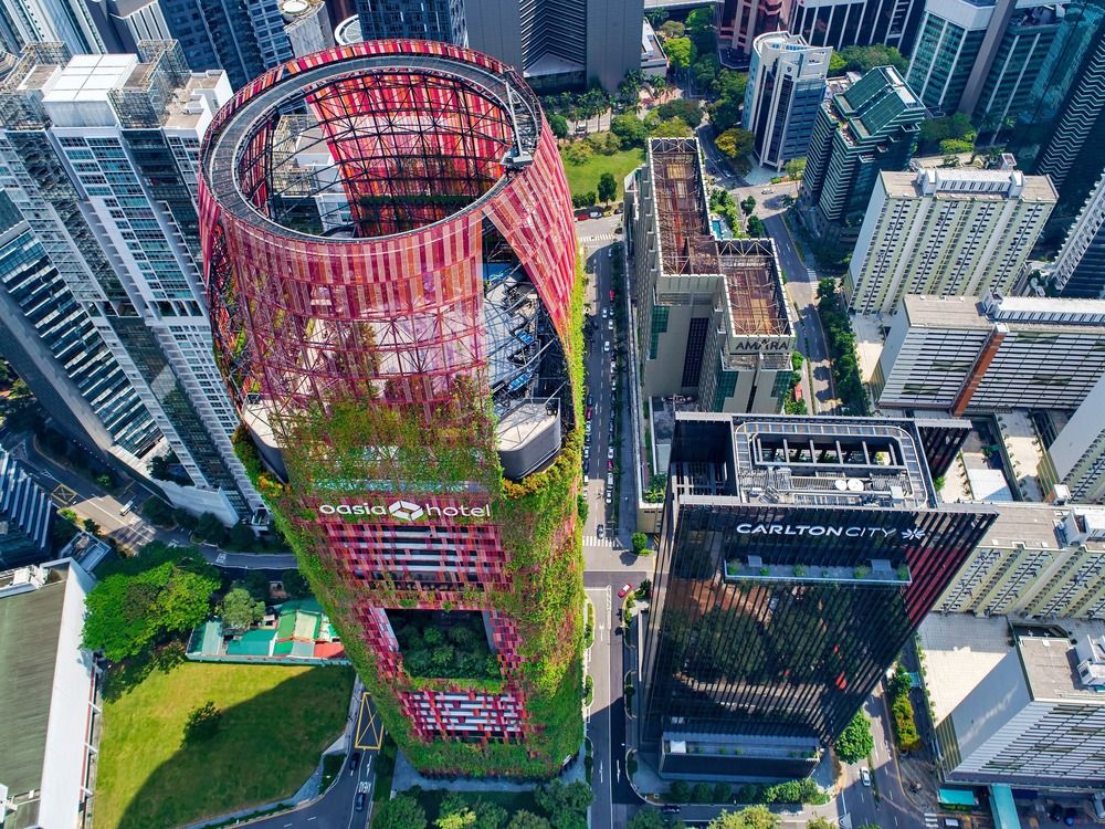 Haute de 190 mètres, la tour compte quatre vastes espaces extérieurs : trois énormes vérandas au 6e, 12e et 21e étage, ainsi qu'un toit-terrasse au 27e étage. Celui-ci est entouré d'un écran haut de 10 étages, couvert du même bardage de résille d'aluminium rouge que le reste du bâtiment. Cette façade sera progressivement recouverte par 21 espèces de plantes grimpantes, faisant radicalement contraster leur vert luxuriant avec le rouge vif des surfaces. Comme la plupart des créations de WOHA, l'hôtel Oasia a été construit à Singapour. Le cabinet WOHA a été fondé en 1994 par le Singapourien Wong Mun Summ, en partenariat avec Richard Hassell, originaire d'Australie et résidant à Singapour depuis 1989.