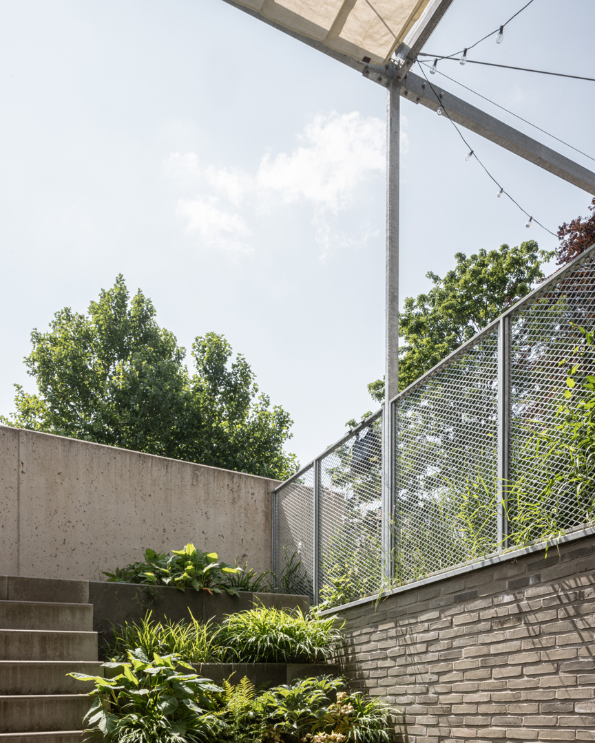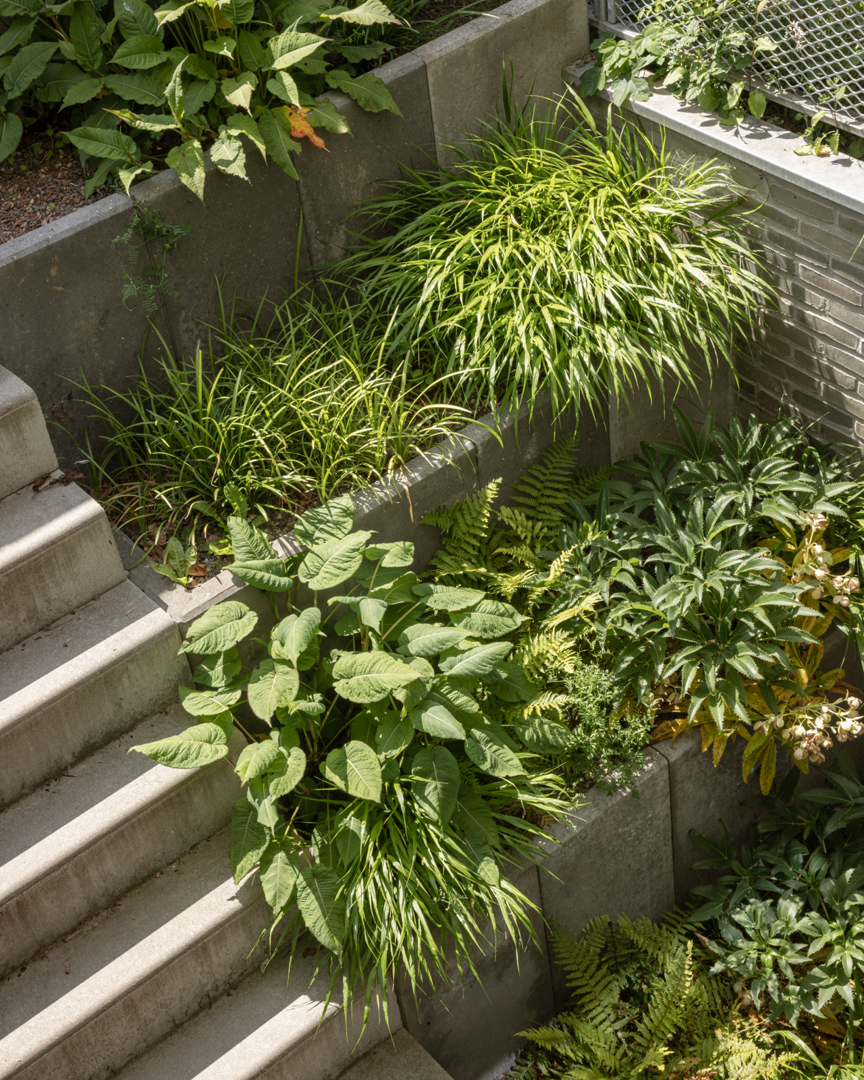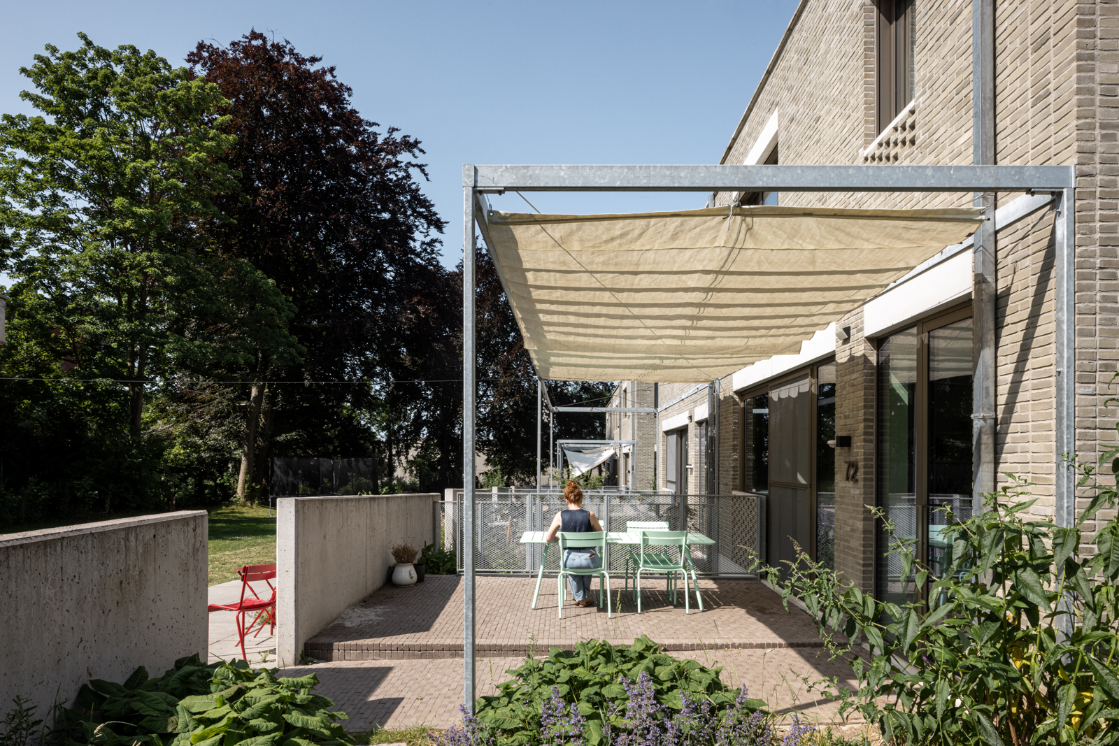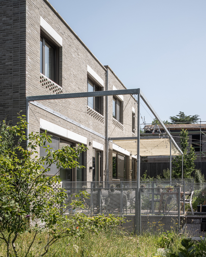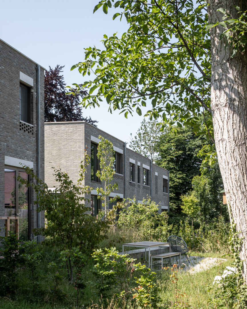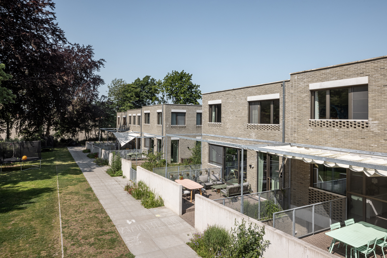 Construire dans un espace intérieur nécessitait une implantation et un accès soigneux. Une piste cyclable publique sert de voie d'accès et est activée avec des fonctions collectives pour interagir avec le quartier. L'accès aux maisons se fait par un large chemin qui délimite le jardin collectif et se termine par une grande terrasse collective : non seulement pour la circulation, mais aussi comme aire de jeux et de séjour. Les volumes des bâtiments sont légèrement tournés par rapport à la rue, limitant les vues et orientant les maisons plus au sud. La tension entre intimité et collectivité a été résolue par une gradation fine des espaces extérieurs utilisant la topographie subtile : des jardins avant surélevés avec terrasse ensoleillée, délimités par un mur bas, offrent de l'intimité sans interrompre la vue sur le jardin collectif.