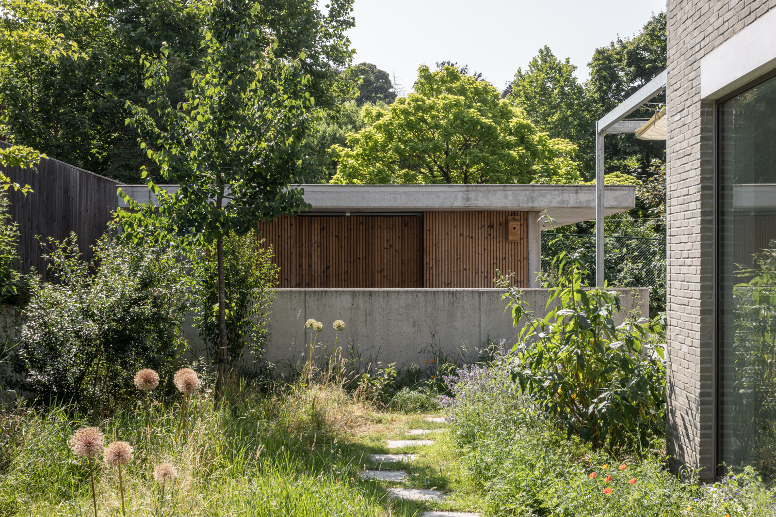 Outre le fait que les maisons sont BEN et équipées de systèmes durables avancés, le projet est également durable au sens le plus large du terme. Il s'agit d'un projet de densification dans une zone résidentielle existante : réaménagement d'un site sous-utilisé dans un quartier bien équipé avec transports publics, écoles et commerces à distance de marche. La piste cyclable publique renforce la mobilité douce dans le quartier. L'accent est mis sur la préservation maximale des arbres existants et de la lisière forestière avec un espace pour la biodiversité. Les eaux pluviales sont collectées par maison, tamponnées collectivement et infiltrées sur le site. Le modèle d'habitat groupé offre également une réponse à l'isolement : les fonctions partagées et les espaces extérieurs réduisent l'empreinte écologique et augmentent les opportunités de rencontres et de vie de quartier.