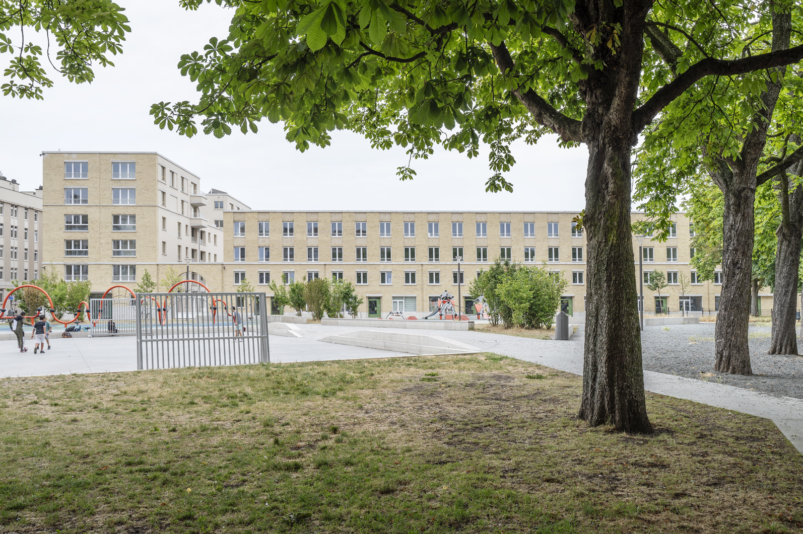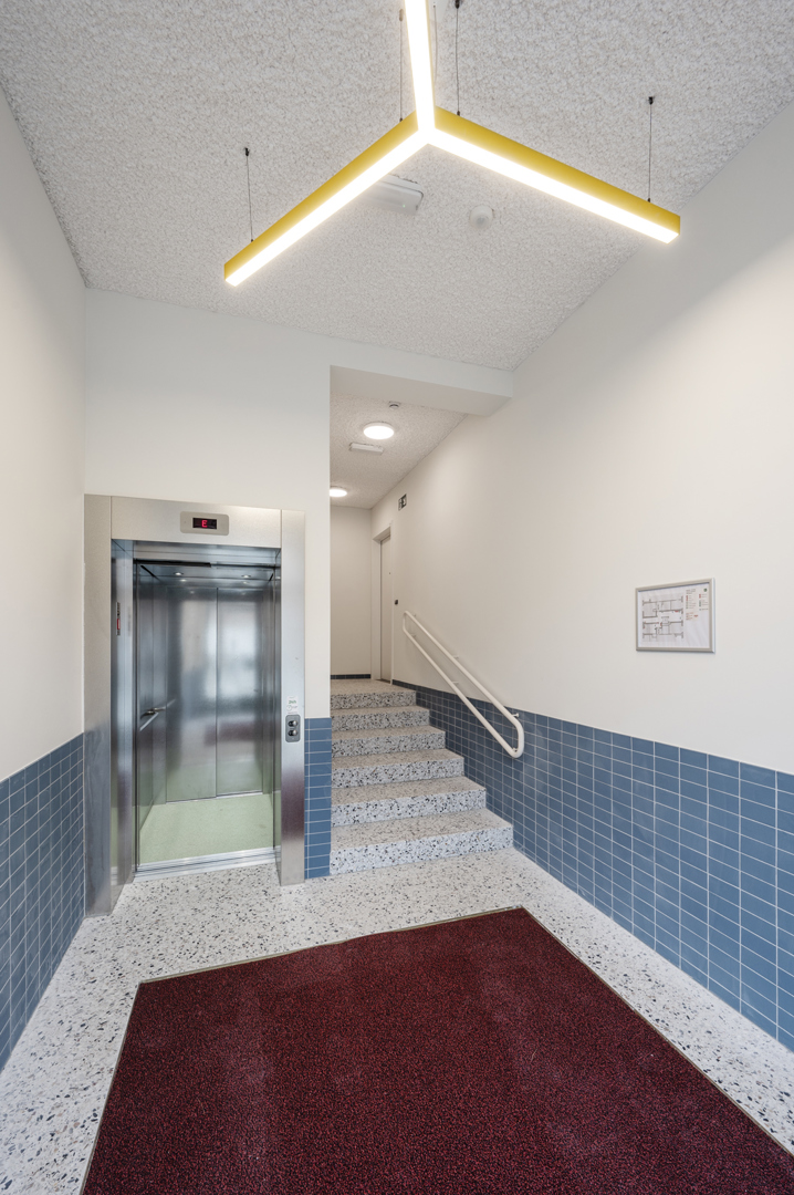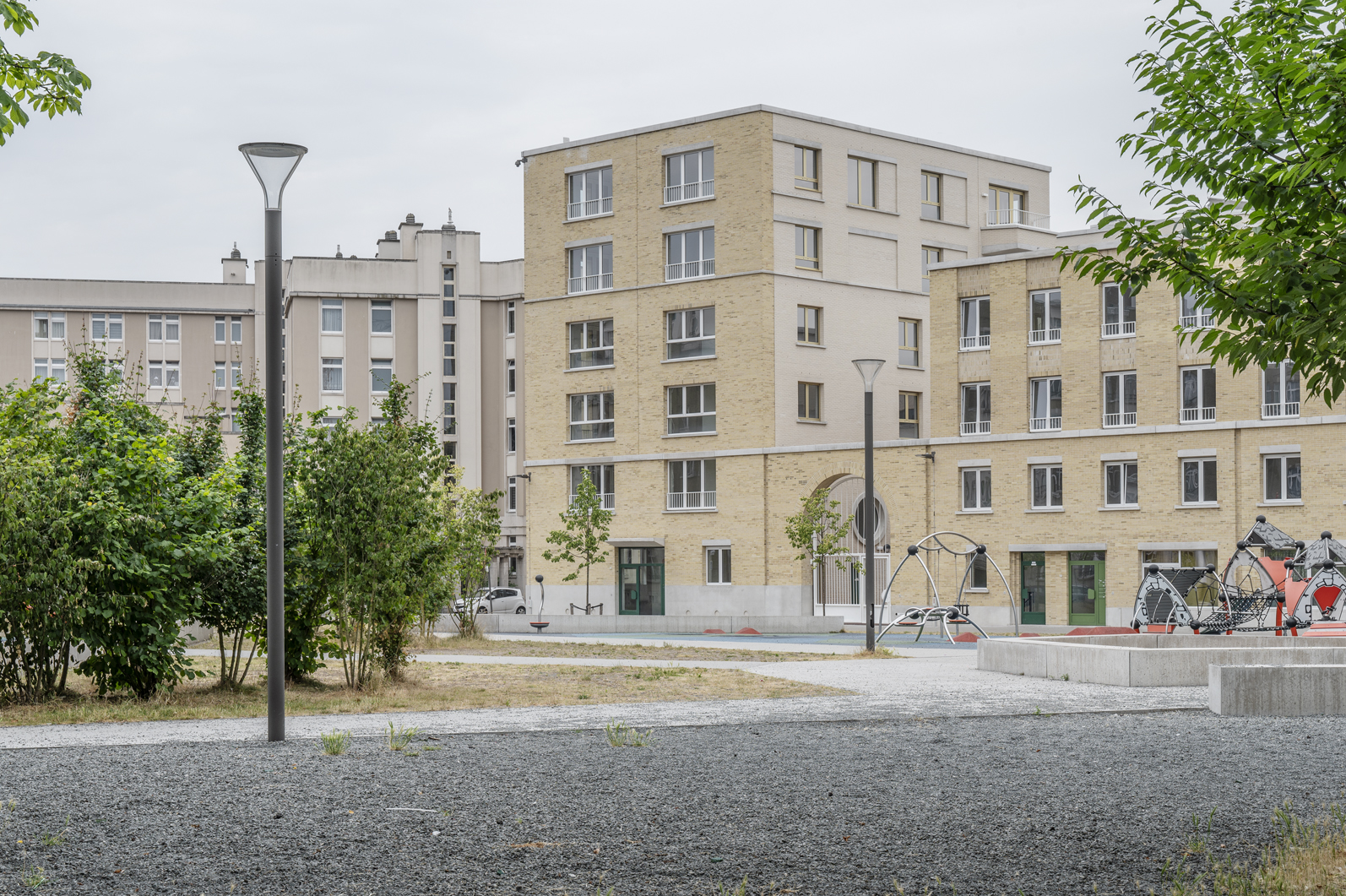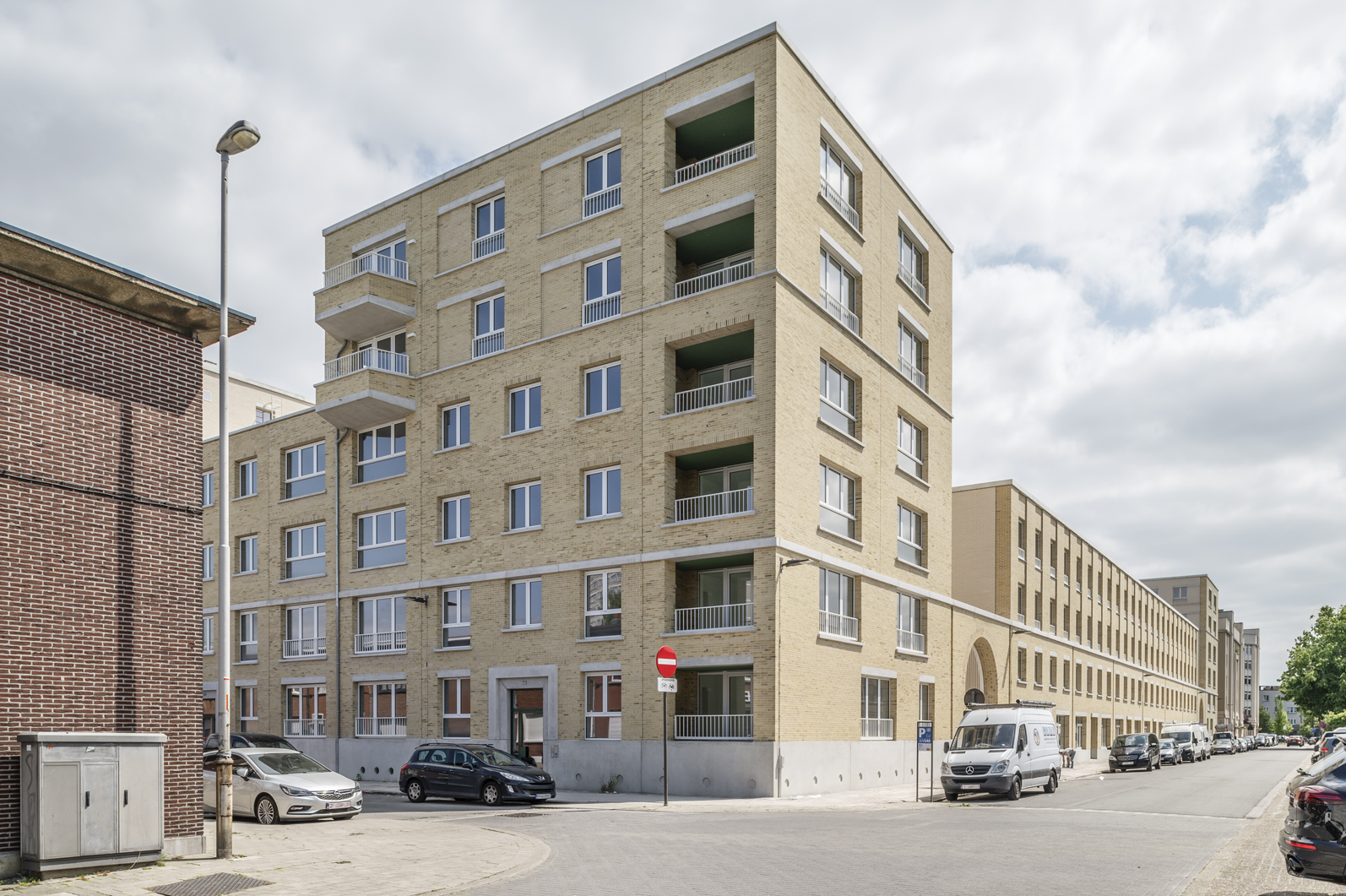 Dans un contexte urbain mouvementé, la conception d'un complexe de logements sociaux s'est centrée sur la dimension d'un bloc entier - la plus grande échelle possible pour l'architecture. En même temps, elle part de la plus petite unité, celle des résidents. Un bâtiment massif et précieux, basé sur le programme, sans trop de mélange de profils d'utilisateurs. Le logement à cette échelle exige une configuration efficace des ensembles résidentiels entre eux et en relation avec l'espace ouvert. C'est pourquoi une empathie rationnelle est d'autant plus importante dans cet exercice, traduit spatialement comme « de grands bâtiments avec de petits moments ». Dans l'articulation, le détail et la matérialité de la construction, l'ensemble plus vaste redevient domestique, tactile et sensoriel. Reconnaissable, centré sur l'humain et à la mesure de l'individu.