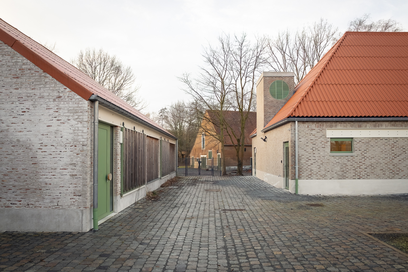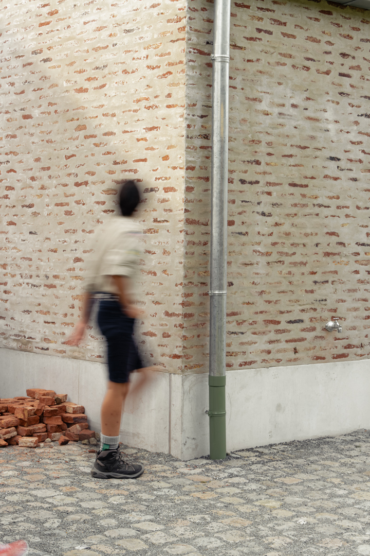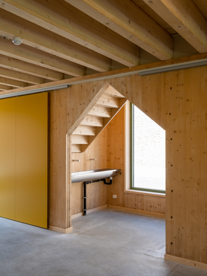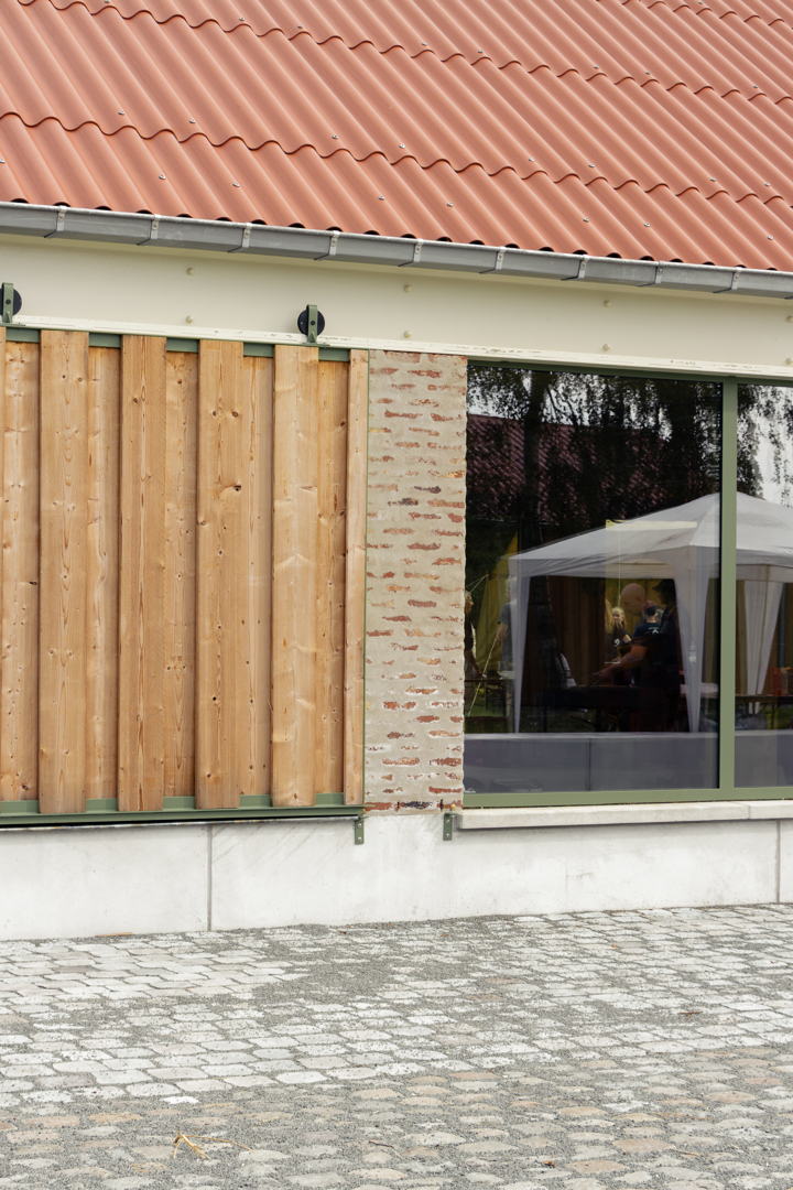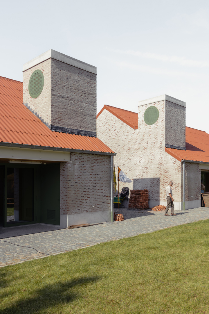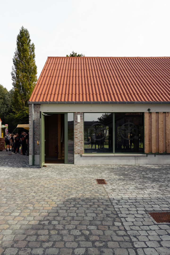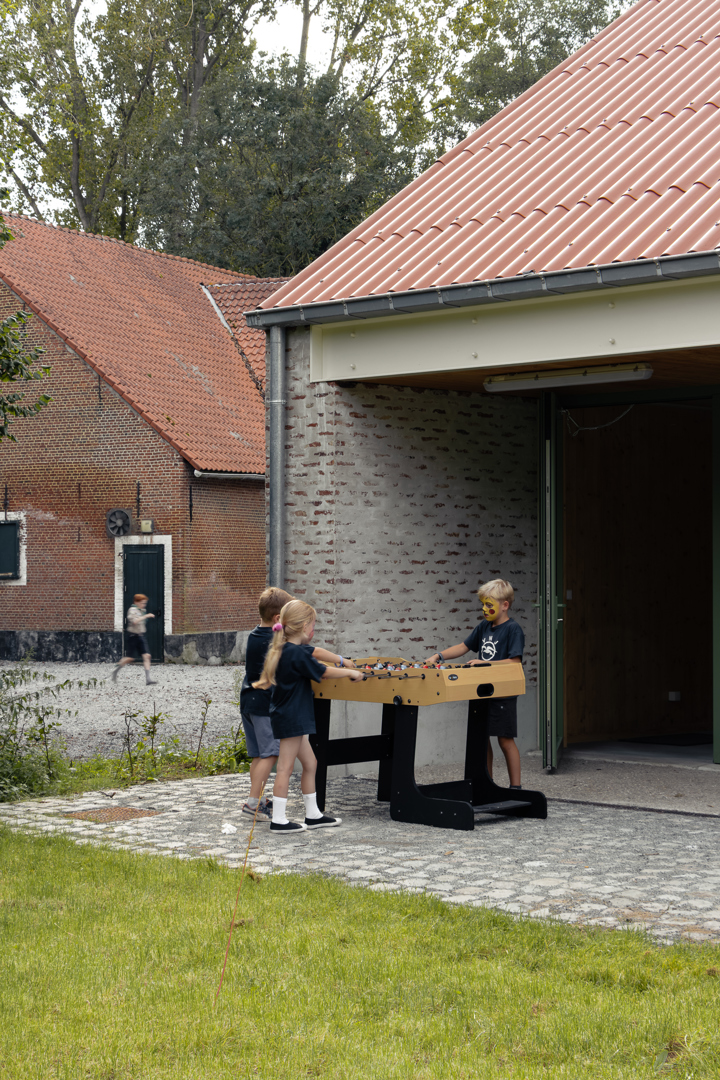 Les différents bâtiments des chambres se subordonnent au vert auquel ils appartiennent. Leur impact est minimal et humble. Dans le cluster jeunesse, le bâtiment de la ferme existante a été rénové et transformé en salle de fête. Les deux nouveaux locaux en miroir pour les mouvements de jeunesse tentent de donner au programme relativement petit un certain degré de maturité publique et de stature. Dans la matérialisation des bâtiments, nous cherchons à nous connecter au reste de la famille. La structure interne complète est en CLT, les éléments existants - y compris les poutres en bois - ont été restaurés et la maçonnerie de la façade a également été revitalisée. Le drainage de l'aménagement extérieur est relié au système d'eau du parc et se connecte à une grande wadi en tant que bassin de grenouilles.