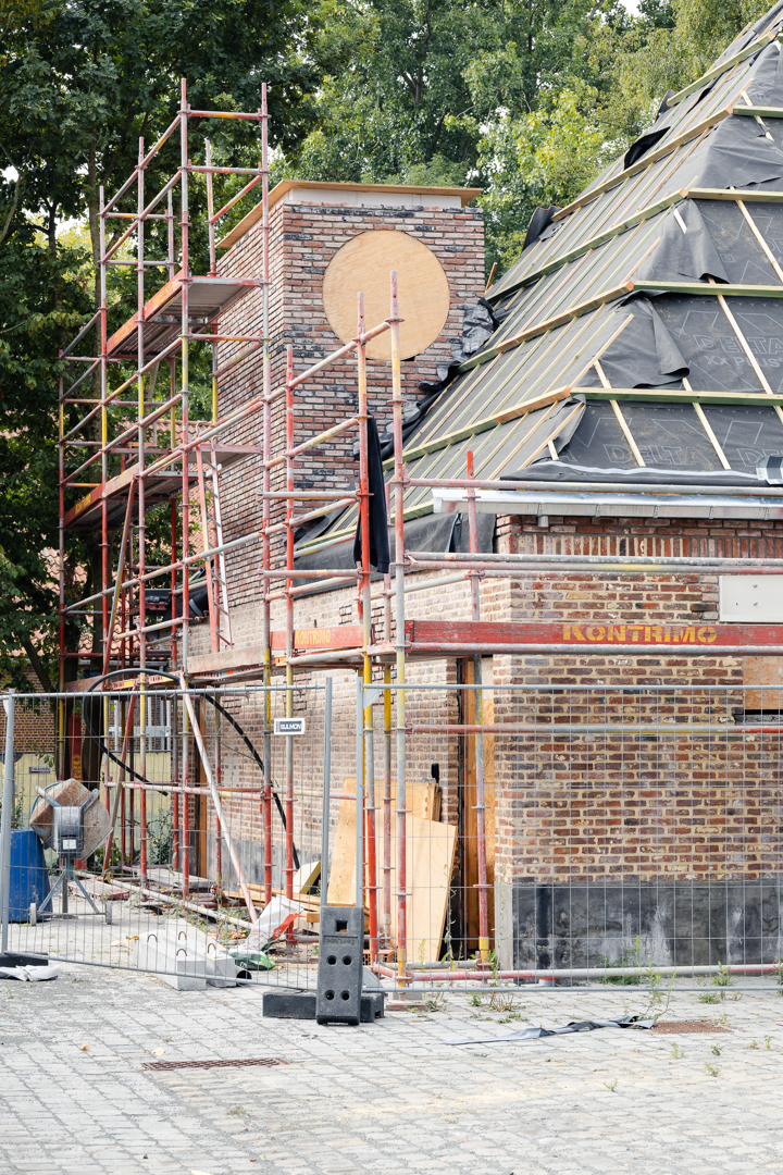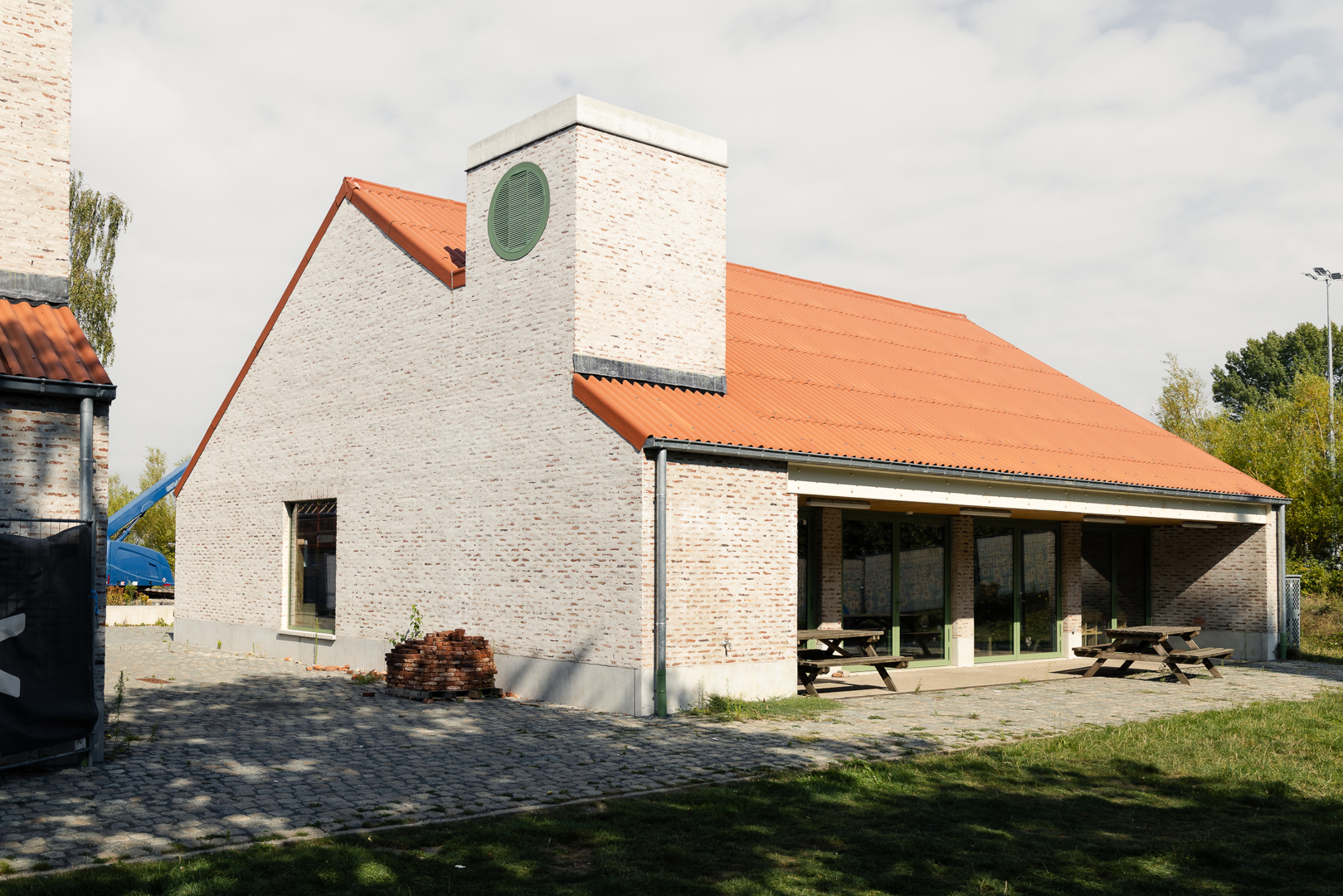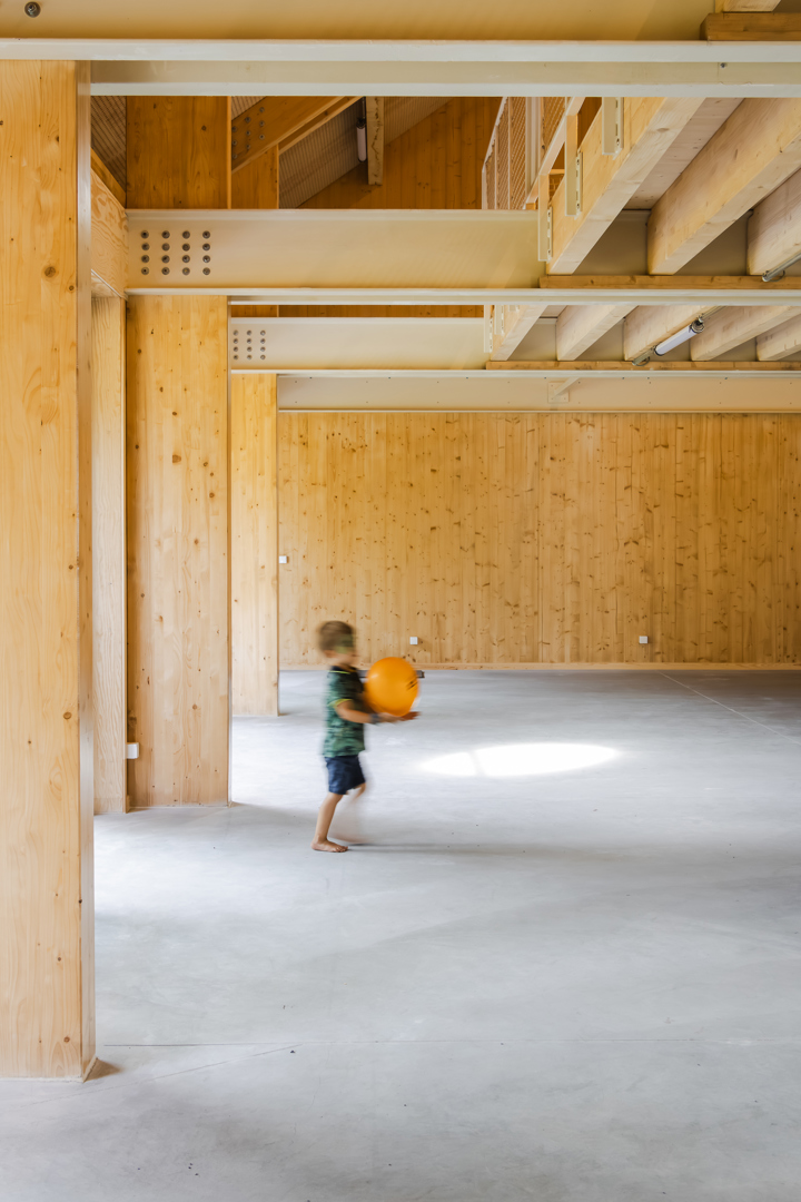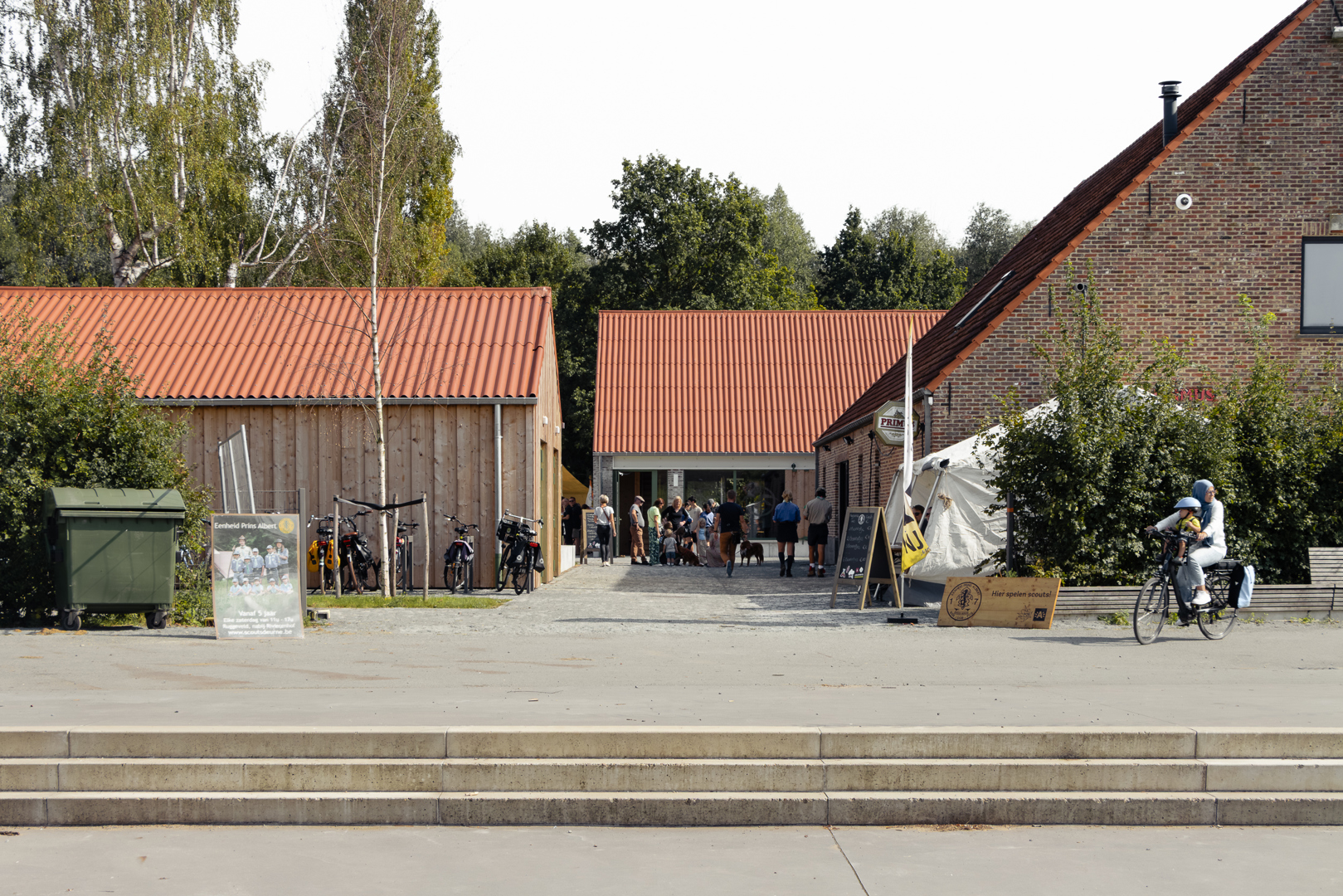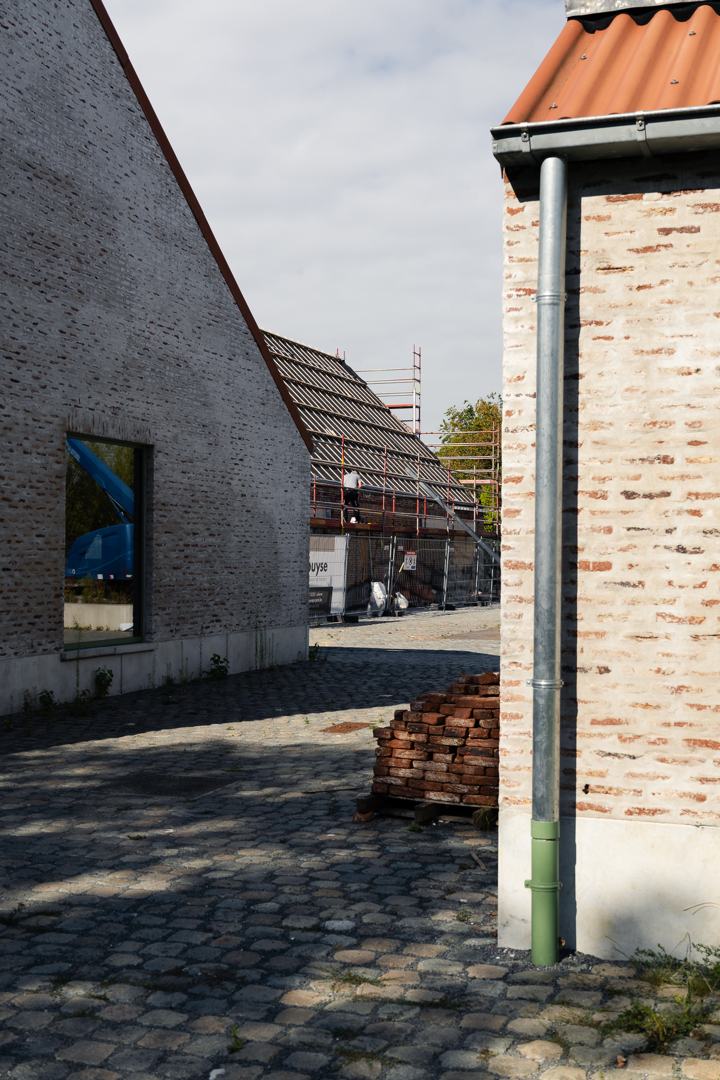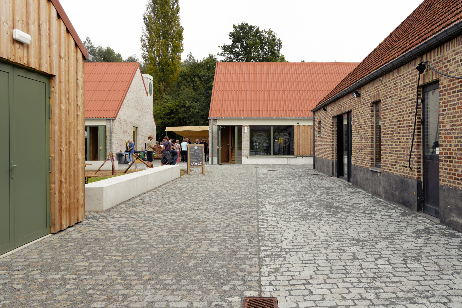 Les différents bâtiments des chambres se subordonnent au vert auquel ils appartiennent. Leur impact est minimal et humble. Dans le cluster jeunesse, le bâtiment de la ferme existante a été rénové et transformé en salle de fête. Les deux nouveaux locaux en miroir pour les mouvements de jeunesse tentent de donner au programme relativement petit un certain degré de maturité publique et de stature. Dans la matérialisation des bâtiments, nous cherchons à nous connecter au reste de la famille. La structure interne complète est en CLT, les éléments existants - y compris les poutres en bois - ont été restaurés et la maçonnerie de la façade a également été revitalisée. Le drainage de l'aménagement extérieur est relié au système d'eau du parc et se connecte à une grande wadi en tant que bassin de grenouilles.