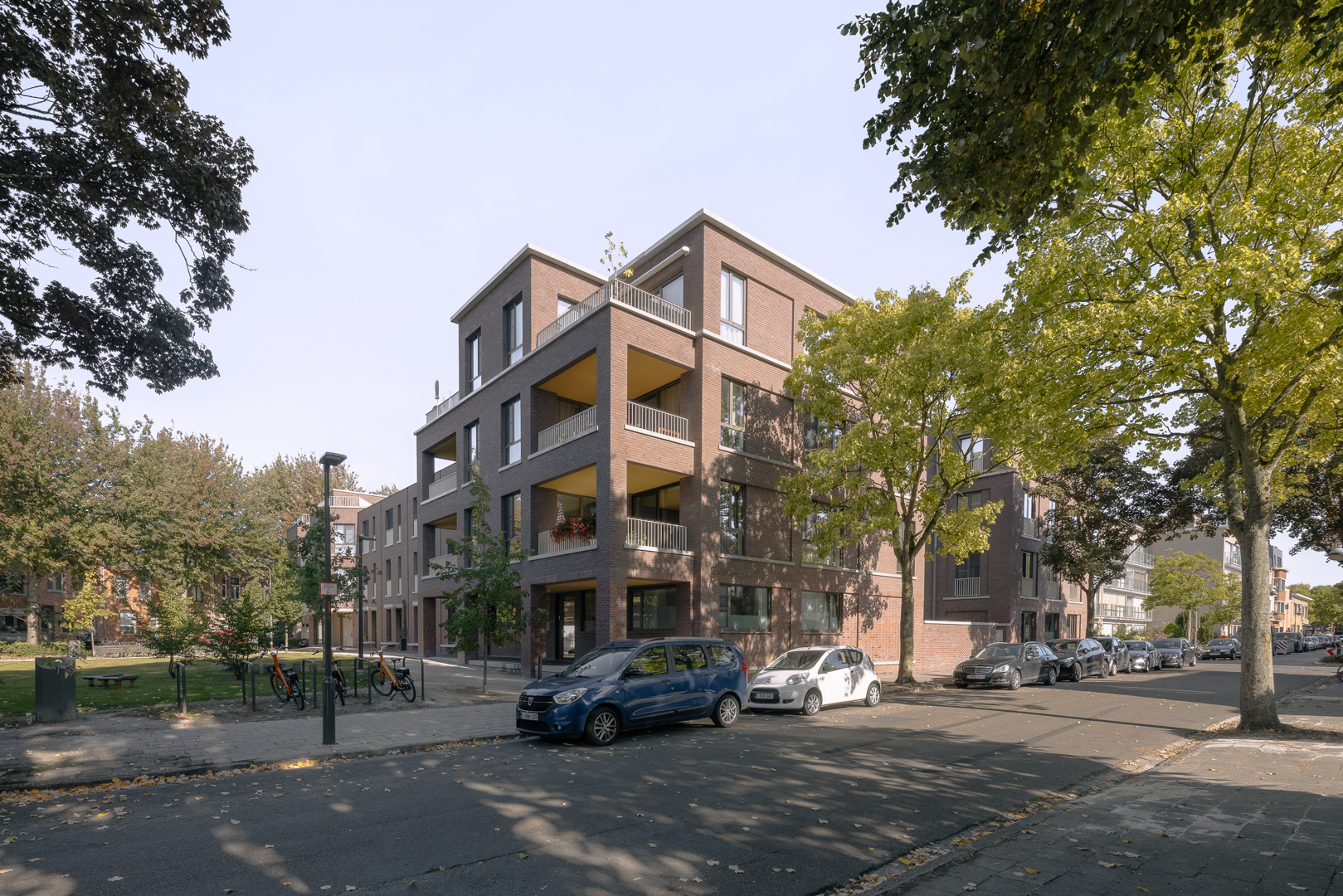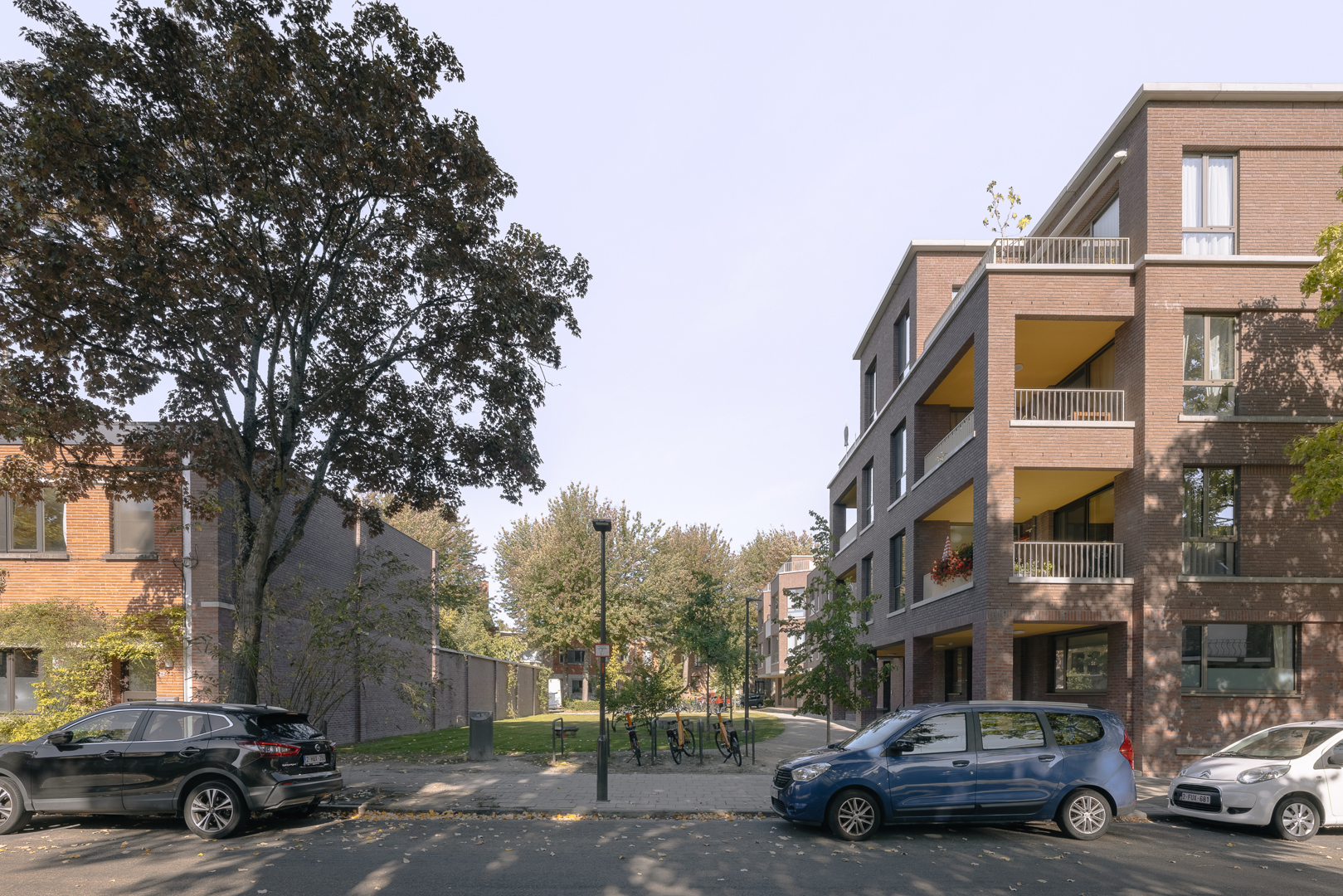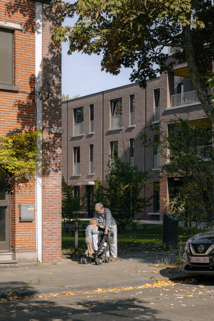 Ville dans la ville. Le potentiel de croissance à Mortsel est souvent caché dans de grandes « chambres extérieures » - derrière les rubans de petites maisons mitoyennes ou de villas. Dans le noyau des blocs de construction, un certain danger réside dans la croissance : les sauts d'échelle provoquent divers conflits entre privé et public, créant une sorte de Ville dans la Ville. L'implantation des nouveaux volumes dans le Perenpit restaure le tissu fragmenté, qui oscille en termes de texture entre la villa cottage et l'immeuble d'appartements, et reforme une frontière claire entre public et privé. Les bâtiments se tiennent ensemble comme une famille cohérente et s'intègrent doucement à l'échelle du quartier. Le petit parc est destiné au quartier et le jardin aux résidents. Les espaces extérieurs verts sont subtilement connectés et contribuent chacun à un agréable climat de vie.