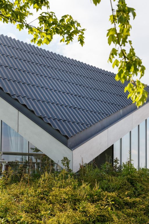 La forme du toit n'est pas sans rappeler ces granges agricoles typiques qui font partie du paysage dans cette contrée. Le rythme ludique de la toiture et les ondulations caractéristiques de la plaque ondulée s'accordent à merveille avec les toits des bâtiments environnants.