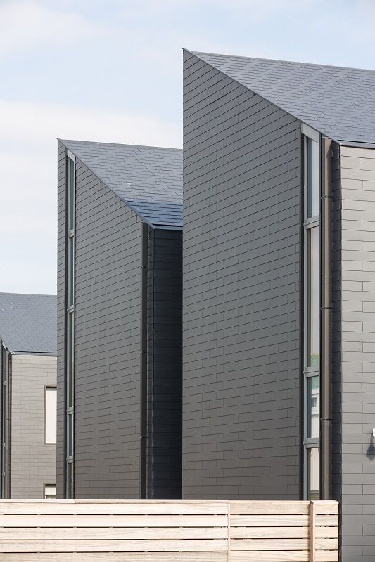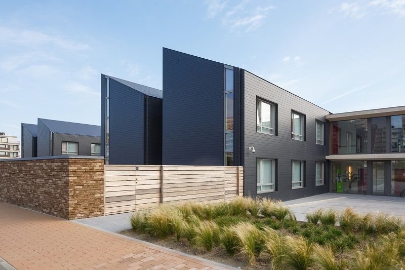 Les chambres individuelles de séjour/soins se trouvent dans une deuxième entité comprenant quatre ailes de longueur réduite, orientées en direction de l’espace d’accès et du parc avoisinant. Les bardages d’ardoises foncées en fibres-ciment leur confèrent, en contraste, une allure plus citadine. Ces deux entités architecturales sont reliées par une troisième, un volume parallélépipédique qui, par le jeu subtil des façades-rideau en verre et des jalousies en lamelles multicolores, donne une impression de transparence et d’enjouement. Ce volume de liaison abrite des chambres de séjour, une salle poly valente et des bureaux.