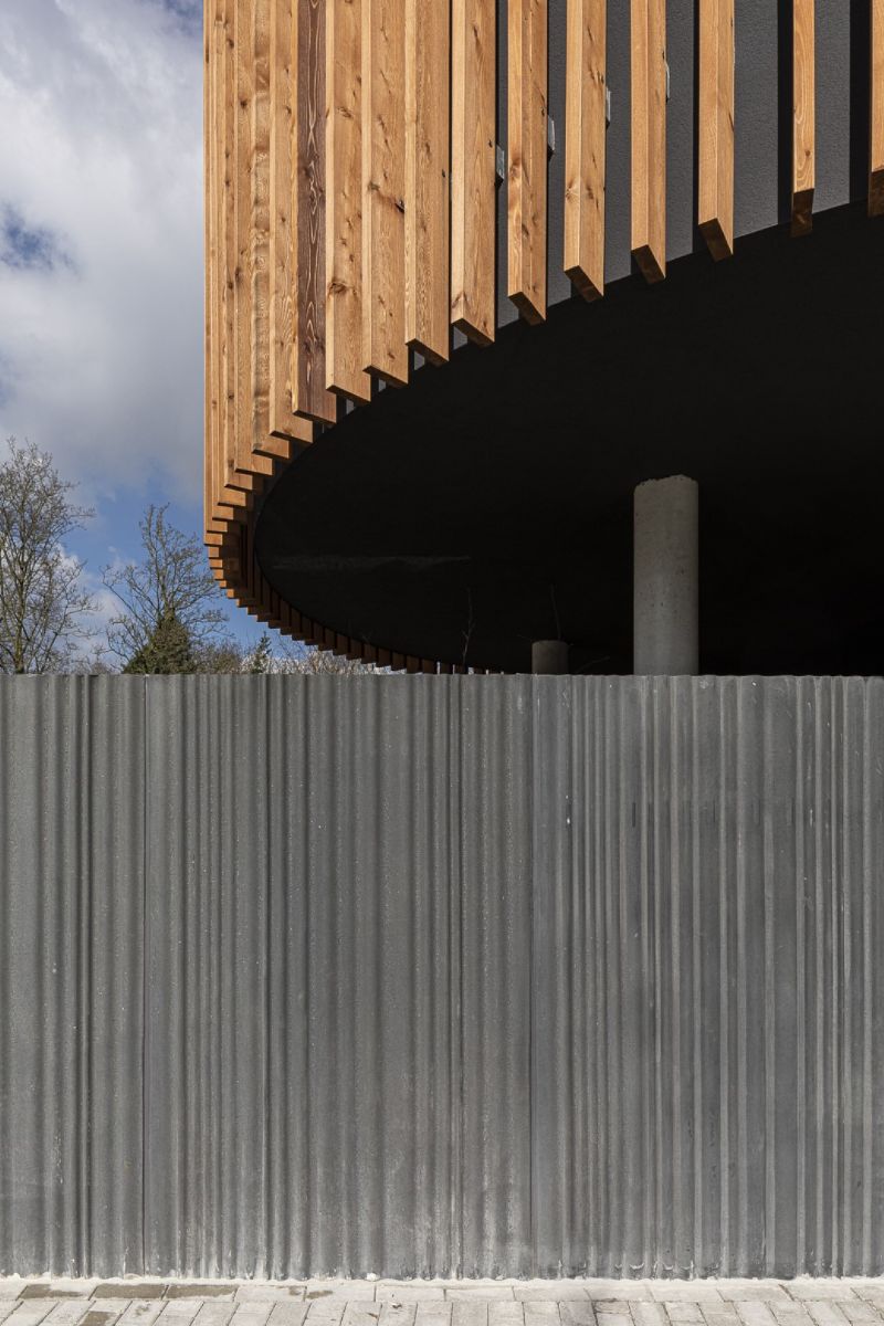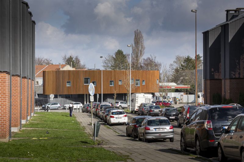 Le nouveau commissariat, situé à un endroit stratégique à l'entrée de la ville, se caractérise par une dualité de formes et de matériaux (béton architectonique - bois) et par sa conception façon smart building.
